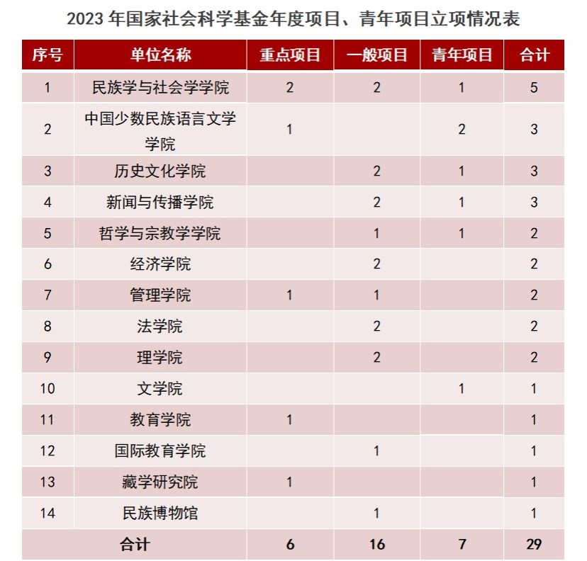 从本次获批的项目类别来看,学校高层次项目的质量进一步提升。从学科分布看,传统优势学科立项数较多,体现了相关学科的特色与优势,其中民族学立项数为9项,进一步为我校铸牢中华民族共同体意识研究奠定基础。
