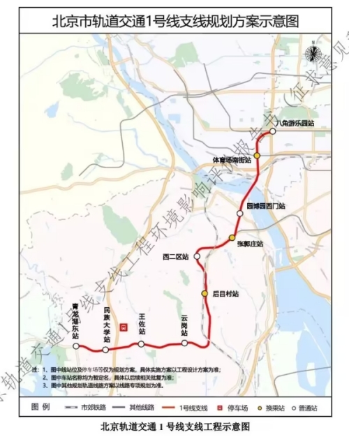 1号线支线,主要沿石景山路、体育场南街、景阳西街、长顺一路、园博园南路、规划梅市口路、云岗路、王佐路、魏各庄路、良三路等道路敷设,线路全长约21公里。全线采用地下敷设方式,共设车站10座。从目前公示的工程示意图看,1号线支线10座车站由东向西包括:八角游乐园站、体育场南街站、园博园西门站、张郭庄站、西二区站、后吕村站、云岗站、王佐站、民族大学站、青龙湖东站(车站名称均为暂定名,具体以后续相关批复为准)。作为既有1号线向中心城区西南方向延伸服务的支线,1号线支线项目的建设可强化沿线对外出行供给,提供大容量、公交化的轨道交通服务。线路起自地铁1号线八角游乐园站,西至丰台区青龙湖地区,串联中关村丰台园西二区、中关村丰台园西一区、新首钢高端综合产业服务区等功能区。
