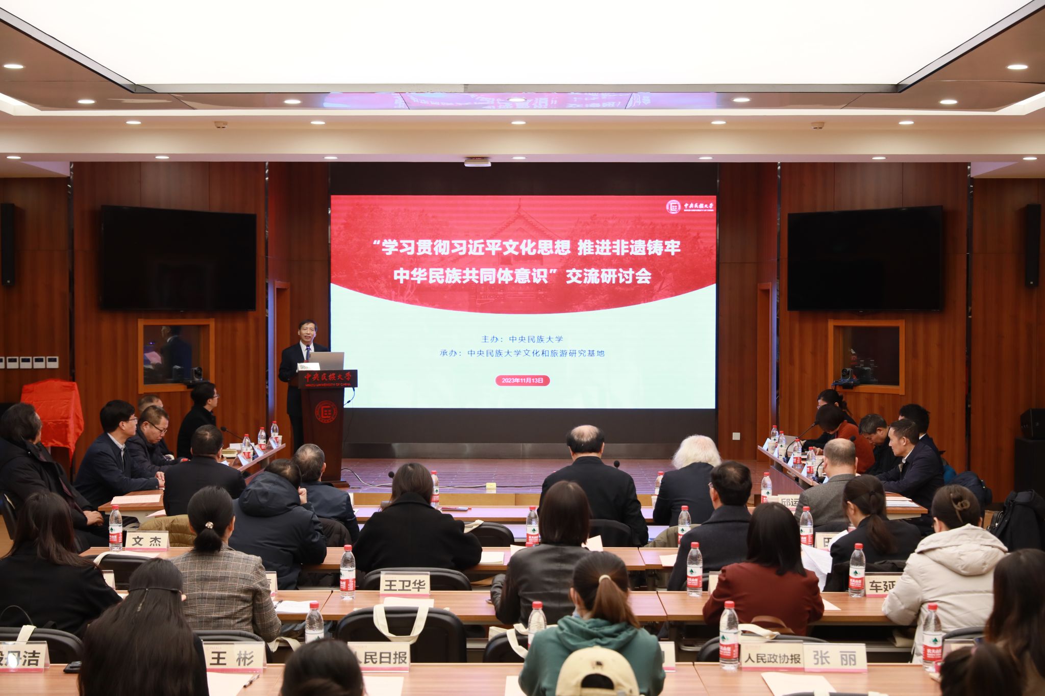 新闻网讯 11月13日,“学习贯彻习近平文化思想 推进非遗铸牢中华民族共同体意识”交流研讨会在海淀校区知行堂召开。由文化和旅游部认定的william威廉中文官网文化和旅游研究基地同时揭牌。校党委副书记、校长郭广生,文化和旅游部非遗司司长王晨阳出席会议并分别致辞。会议由校党委常委、副校长强世功主持。