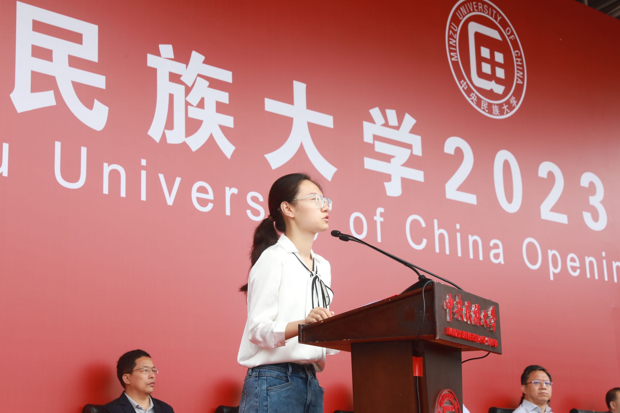 管理学院2021级硕士研究生张靖萱代表在校生发言,回顾自己在民大走过的7个春夏秋冬,她感激民大用毫无保留的信任和无比广阔的平台催生了自己今天的成长。她号召新生们坚持严格的自我要求和不懈的自我磨砺,成长为理想中的自己。