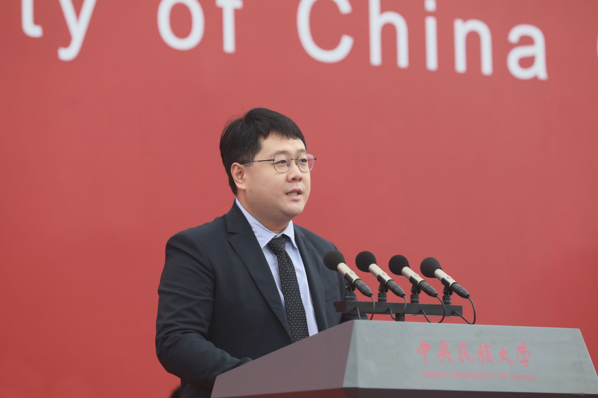 党委副书记、校长郭广生受党委书记张京泽委托,以“以青春之我 共赴时代之约”为题发表讲话。他代表学校党委、代表全校两万多名各族师生员工向民大新人表示欢迎,向陪伴、鼓励、培养、成就他们的亲友、老师表示感谢。“今天,你们与民大开启了一场美丽的遇见。”“感谢这场明媚秋日中美好而珍贵的遇见,我想,它必将成为你人生旅程中一段刻骨铭心的记忆。”他说,你们遇见的民大,是一所始终坚持向党而立、矢志报国的民大;你们遇见的民大,是一所始终坚持向美而生、以美化人的民大;你们遇见的民大,是一所始终坚持向真而行、潜心为学的民大;你们遇见的民大,是一所始终坚持向兴而进、锐意进取的民大。