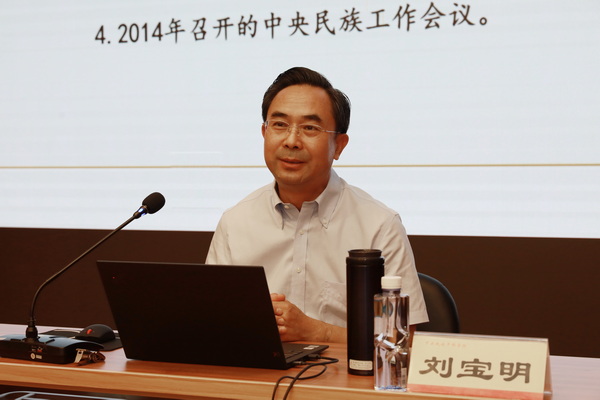 中央民族干部学院民族干部教育研究中心主任、中央民族干部学院“党的民族工作研究与宣讲创新团队”负责人刘宝明教授作铸牢中华民族共同体意识专题辅导。他从深刻认识中央民族工作会议的重大意义、深刻把握提出的新思想新论断新要求、把握紧紧围绕铸牢中华民族共同体意识目标任务推动新时代民族工作高质量发展三个方面,从理论与实践相结合、历史与现实相结合、深刻分析与生动故事相结合的角度,讲述了什么是中华民族共同体意识、为什么要铸牢中华民族共同体意识、铸牢什么样的中华民族共同体意识、怎样铸牢中华民族共同体意识等最基本最重要的问题,进一步加深了对铸牢中华民族共同体意识的认识,对深入学习贯彻中央民族工作会议精神、推动学校工作高质量发展具有深刻的启发意义。