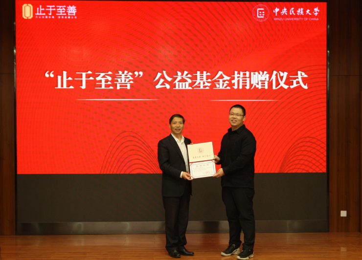 捐赠仪式上,郭广生指出,今年是学校发展历程中的关键之年,何理校友的捐赠具有重要意义。一是学校即将喜迎校庆70周年。建校以来,民大始终传承红色基因,为民族团结进步事业做出巨大贡献,在建党100周年和校庆70周年之际,校友捐款为学校发展增添了动力。二是新校区建设积极推进。丰台校区建设对学校发展具有里程碑式的意义,何理是学校人才培养取得成效的典型代表,校友回馈母校可以为学校迈向新征程添砖加瓦。三是中国兴边富民战略研究院蓬勃发展。中国兴边富民战略研究院是国家民委批准设立的高端智库,具有特定的研究领域和特殊的研究方法,在定向捐赠的支持下,研究院将在科学研究和服务兴边富民、乡村振兴国家战略中做出积极贡献。郭广生为北京止于至善投资管理有限公司颁发捐赠证书。