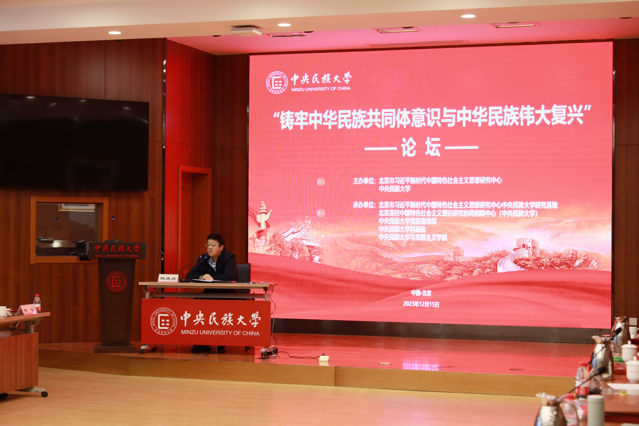 韩庆祥作了题为《中华民族统一性与中华民族共同体意识》的主旨报告,阐释了中华文明的统一性与中华民族共同体意识的具体内容,强调强国建设、民族复兴,需要使全国各族人民能像石榴籽一样紧紧抱在一起,用先进的思想意识和思想理论把全国各族人民组织起来、凝聚起来,为全国各族人民团结奋斗奠定共同思想意识基础。在此基础上,把中华文明的统一性、包容性作为铸牢中华民族共同体意识的文化根基,进一步铸牢中华民族共同体意识,进而凝聚全国各族人民的思想共识,从而为其注入强大的思想意识力量。