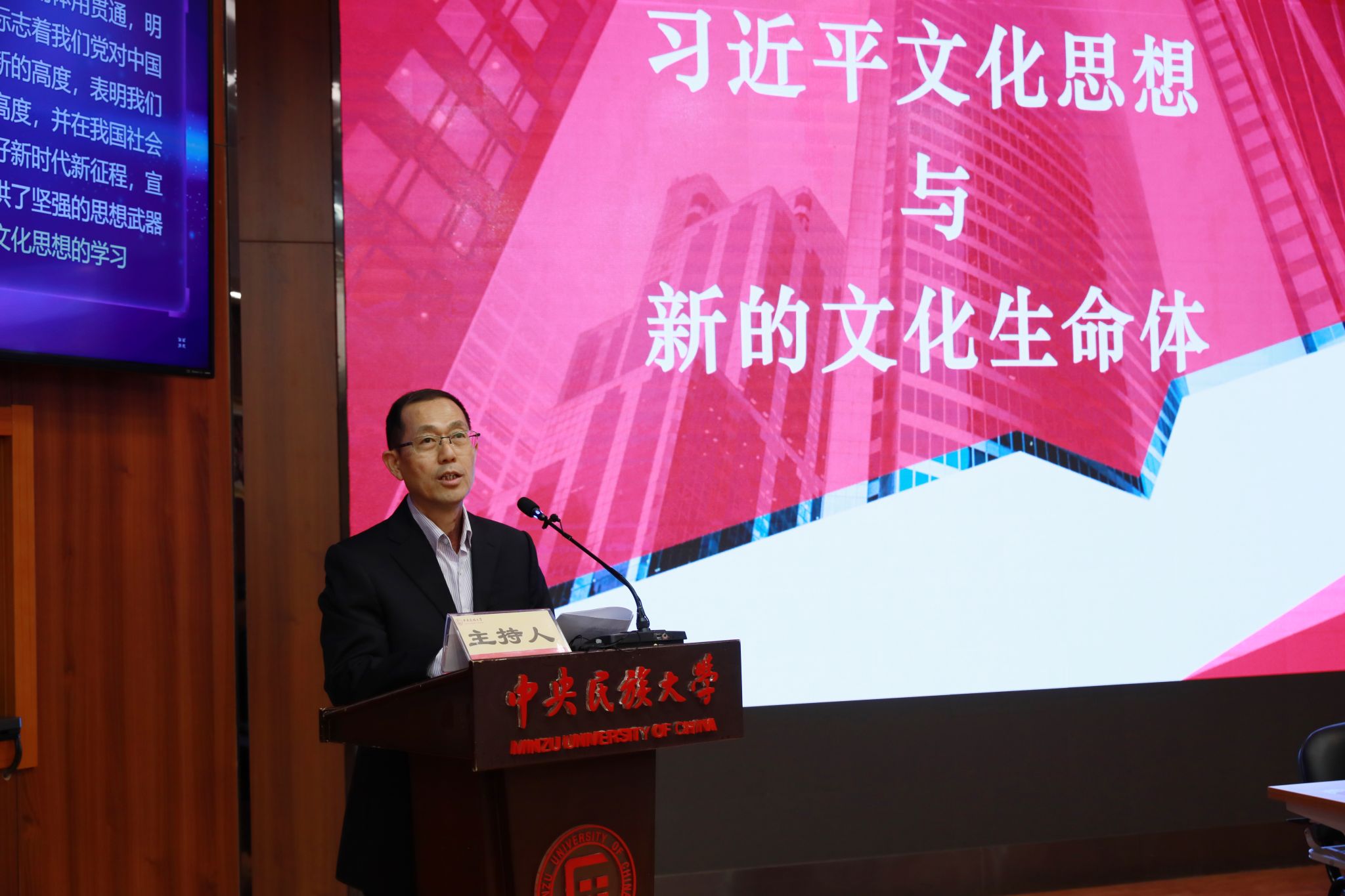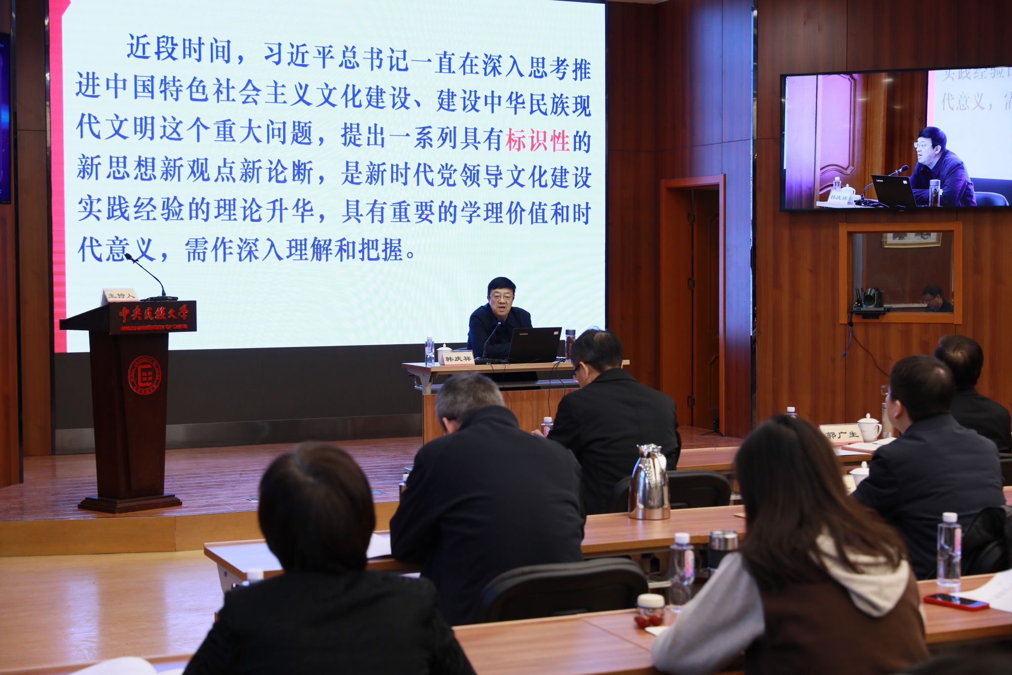 新闻网讯 为深入学习贯彻习近平新时代中国特色社会主义思想,特别是习近平总书记关于加强和改进民族工作的重要思想和习近平文化思想,贯彻落实委党组重点工作任务,加快推进新学期重点工作任务,为学校事业转型升级和高质量发展凝聚力量,2月25日上午,学校在知行堂召开第十二期新学期干部培训班,进一步凝聚思想共识,激发奋进力量。首场报告邀请国家哲学社会科学一级教授,第十三届全国政协委员,中共中央党校(国家行政学院)原校委委员、副教育长韩庆祥以《习近平文化思想与新的文化生命体》为题作专题报告。报告会由校党委副书记邹吉忠主持。