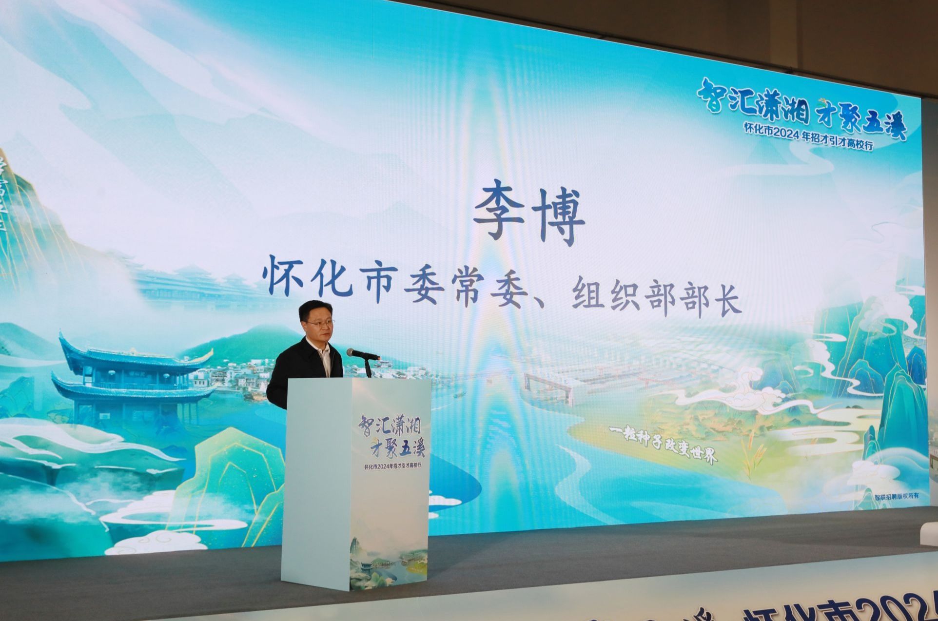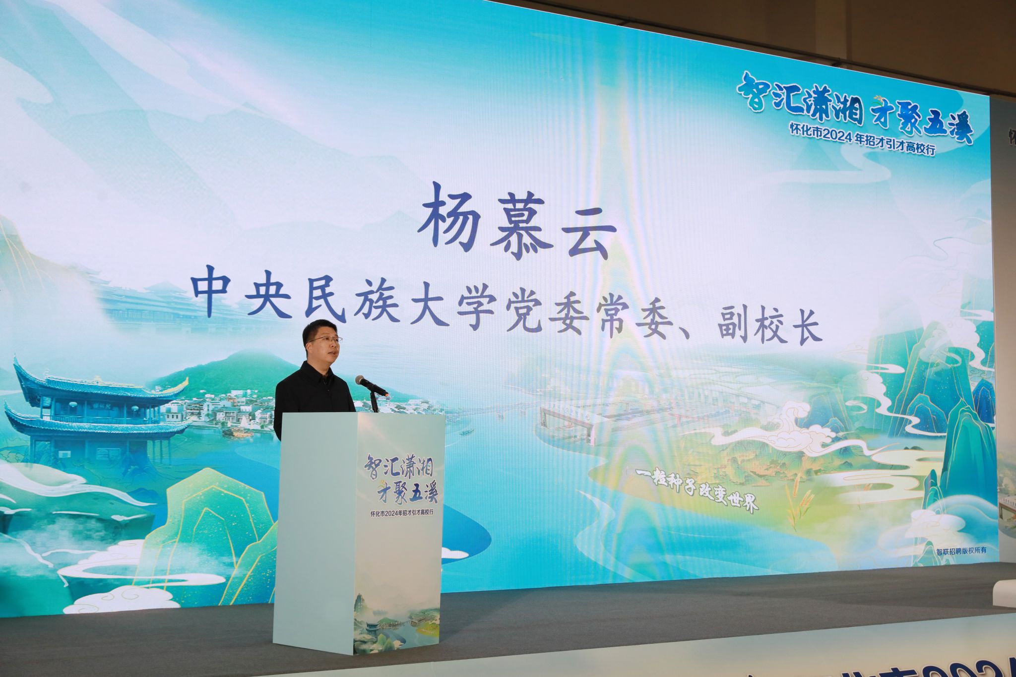 新闻网讯 3月18日,“智汇潇湘·才聚五溪”怀化招才引才高校行活动在学校海淀校区逸夫体育馆举办。学校党委常委、副校长杨慕云,怀化市委常委、组织部部长李博出席。