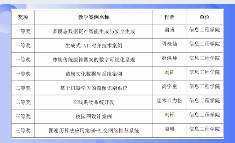 第三届全国高校计算机课程思政教学案例设计大赛由教育部计算机课程思政虚拟教研室主办,桂林电子科技大学承办,大赛共收到来自全国58所高校的200多件作品。其中,我校“多模态数据资产智能生成与安全生成”“生成式AI对齐技术案例”“彝族传统服饰图案的数字可视化呈现”及“苗族文化数据库系统案例”等作品,凭借丰富思政内涵、创新教学方法和较好的教学效果荣获大赛一等奖,展示了学校在计算机科学与技术领域的教学水平和在人工智能赋能思政教育融入课程教学方面的成效。