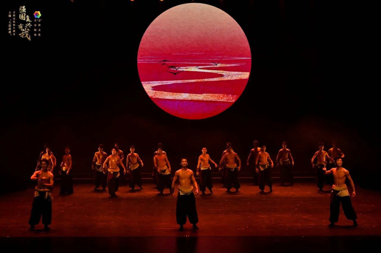 在一轮红日背景下,《我的祖国》那激昂的伴奏声渐强,“大河之子”们的步伐也愈发坚定从容,每一步都像是踏在中华民族伟大复兴的征程上,彰显着新时代青年的担当与力量。