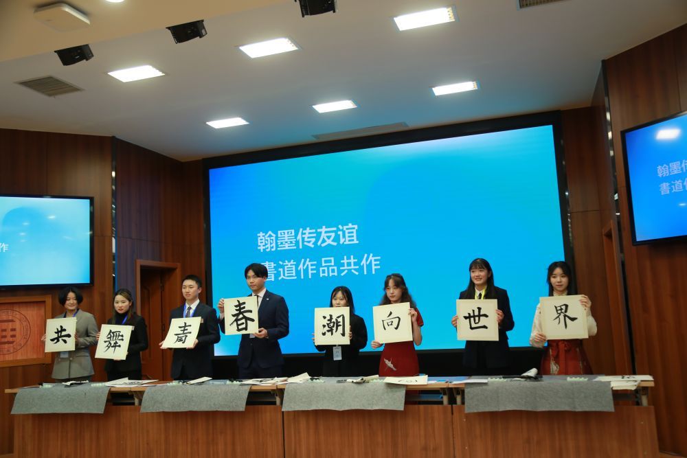 中日青年代表共同创作书法作品“共舞青春 潮向世界”。(中国国际青年交流中心供图)