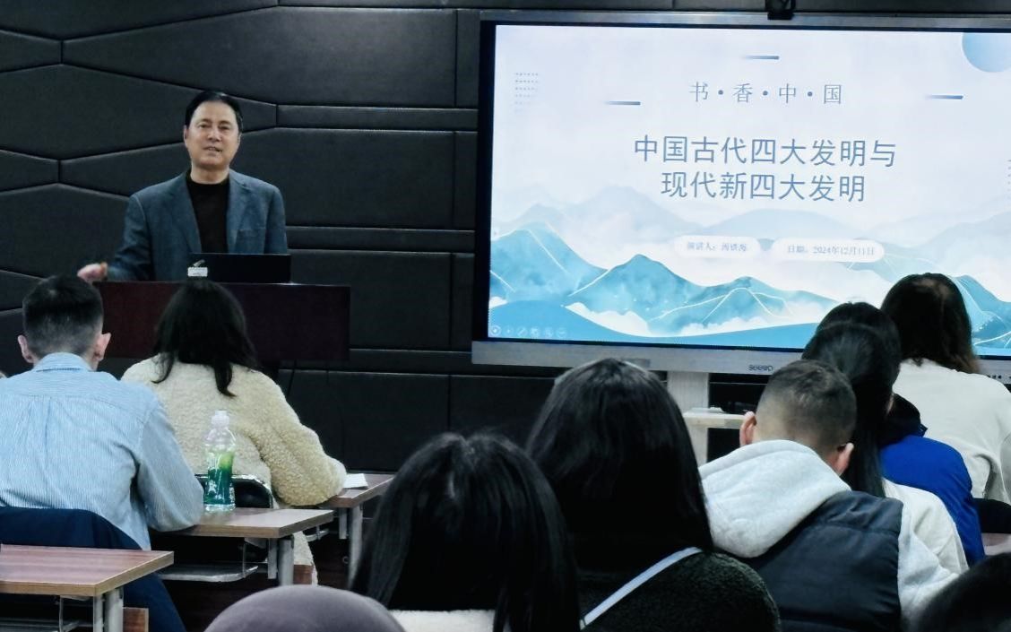 新闻网讯 12月11日下午,国际教育学院党委书记周铁海在学院报告厅为全校近百名留学生作题为“中国古代四大发明与现代新四大发明”的中国国情教育讲座。此次讲座以科技创新为切入点,向国际学生展示中国灿烂的历史文化和当代科技的创新成就,增进留学生对中国国情的理解和认同。