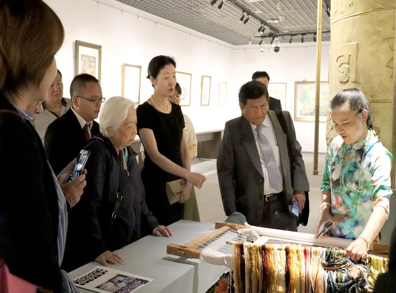 会谈结束后,代表团参观了我校博物馆“锦绣中华”专题展,体验中国非遗文化,外宾对《盛世滋生图》等优秀作品的精湛工艺连声赞叹。