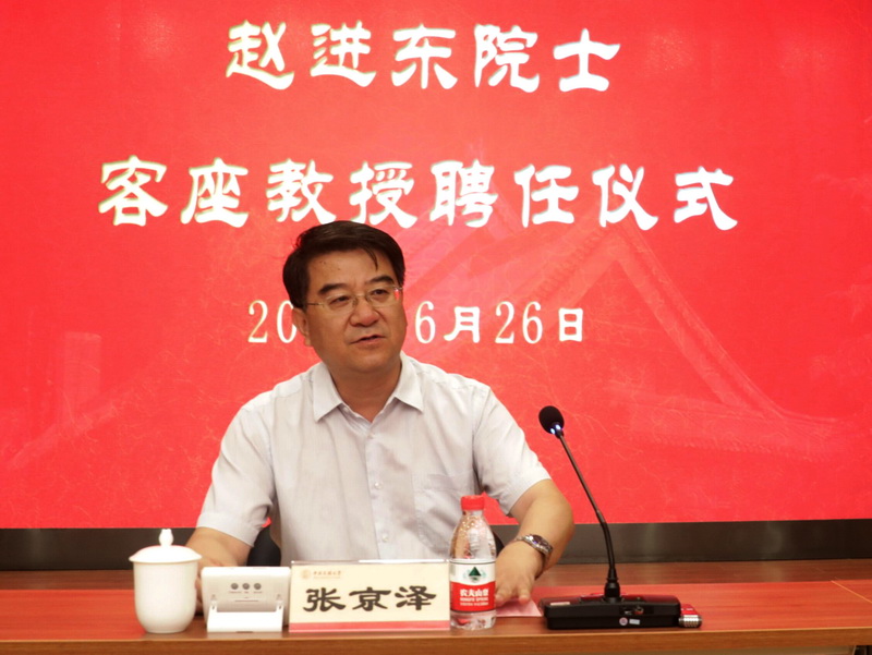 张京泽在致辞中介绍了历届国家领导人对我校发展的重视及学校近些年的发展情况,并介绍了赵进东院士深厚的学术造诣和卓越的领导才能。他指出,方向比努力更重要。赵进东院士受聘为我校客座教授之后,可以为我校相关专业的研究方向、学科发展方向把好关,避免走弯路、偏路;同时,我校可依托赵进东院士的丰富经验和远见卓识,在学科建设、科研、人才培养等方面获得更多指导,在学科建设与专业建设等方面迈上新台阶。
