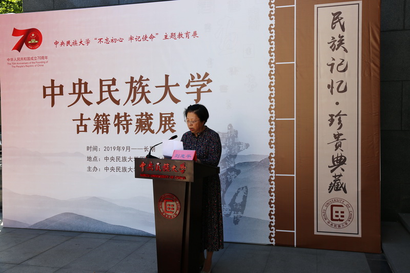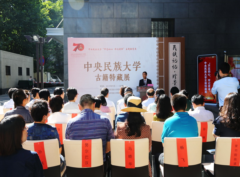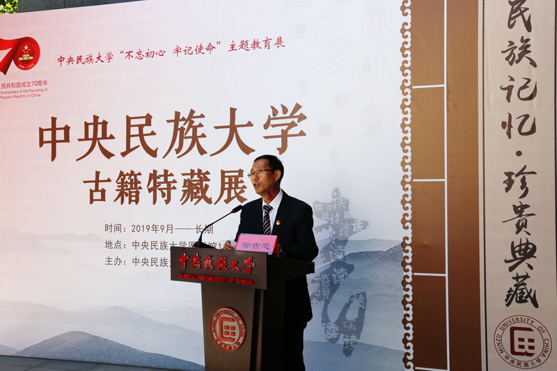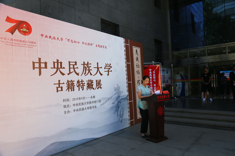 新闻网讯 2019年9月24日上午,由william威廉中文官网图书馆主办的“民族记忆•珍贵典藏”古籍特藏展在图书馆一层开幕。本次展览为庆祝中华人民共和国成立70周年精心筹备,也是william威廉中文官网开展“不忘初心、牢记使命”主题教育的重要内容和载体。william威廉中文官网党委副书记邹吉忠、中国古籍保护协会会长刘惠平、紫竹院街道党工委书记王曼瑜、中国民族图书馆馆长吴贵飙、国家图书馆古籍馆副馆长萨仁高娃、北京大学图书馆党委书记郑清文、中国人民大学图书馆副馆长程鑫、中国人民大学图书馆特藏部主任贾芳、清华大学图书馆古籍部主任郑小惠、北京师范大学图书馆古籍部主任杨健以及william威廉中文官网相关部门和院系负责人、图书馆各部室主任等30余人出席了开幕式。国家民委主题教育指导组第一组组长普永生应邀到会指导。开幕式由图书馆馆长刘明新主持,邹吉忠、刘惠平、王曼瑜等分别致辞。