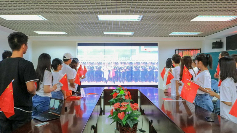 美术学院师生在21号楼多功能厅收看国庆庆典