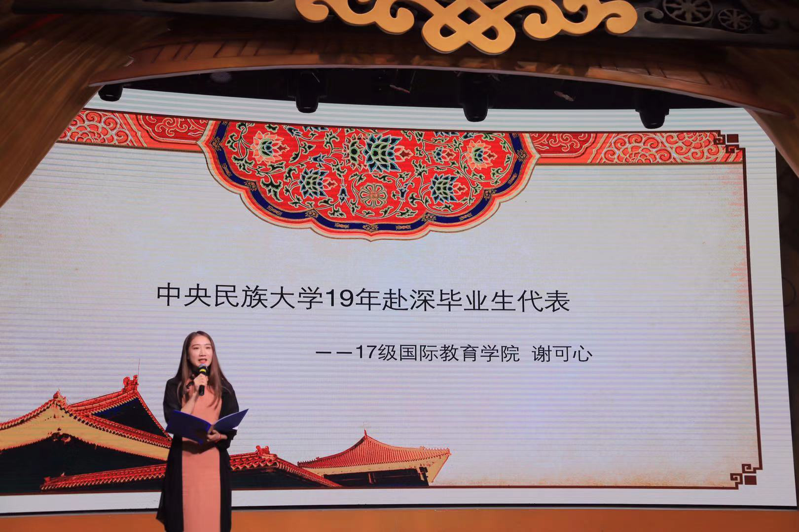 新生代表、2017级汉语国际教育硕士谢可心分享了“感恩、温暖、奋斗”三个词,今年刚毕业的她,成为深圳龙华区的一名小学老师,“本以为自己独在异乡为异客,是民大深圳校友会把我们这些散落在各自岗位的满天星聚成一团火。我不是一个人在孤单前行,因为我身后有一群共同努力的民大人。”