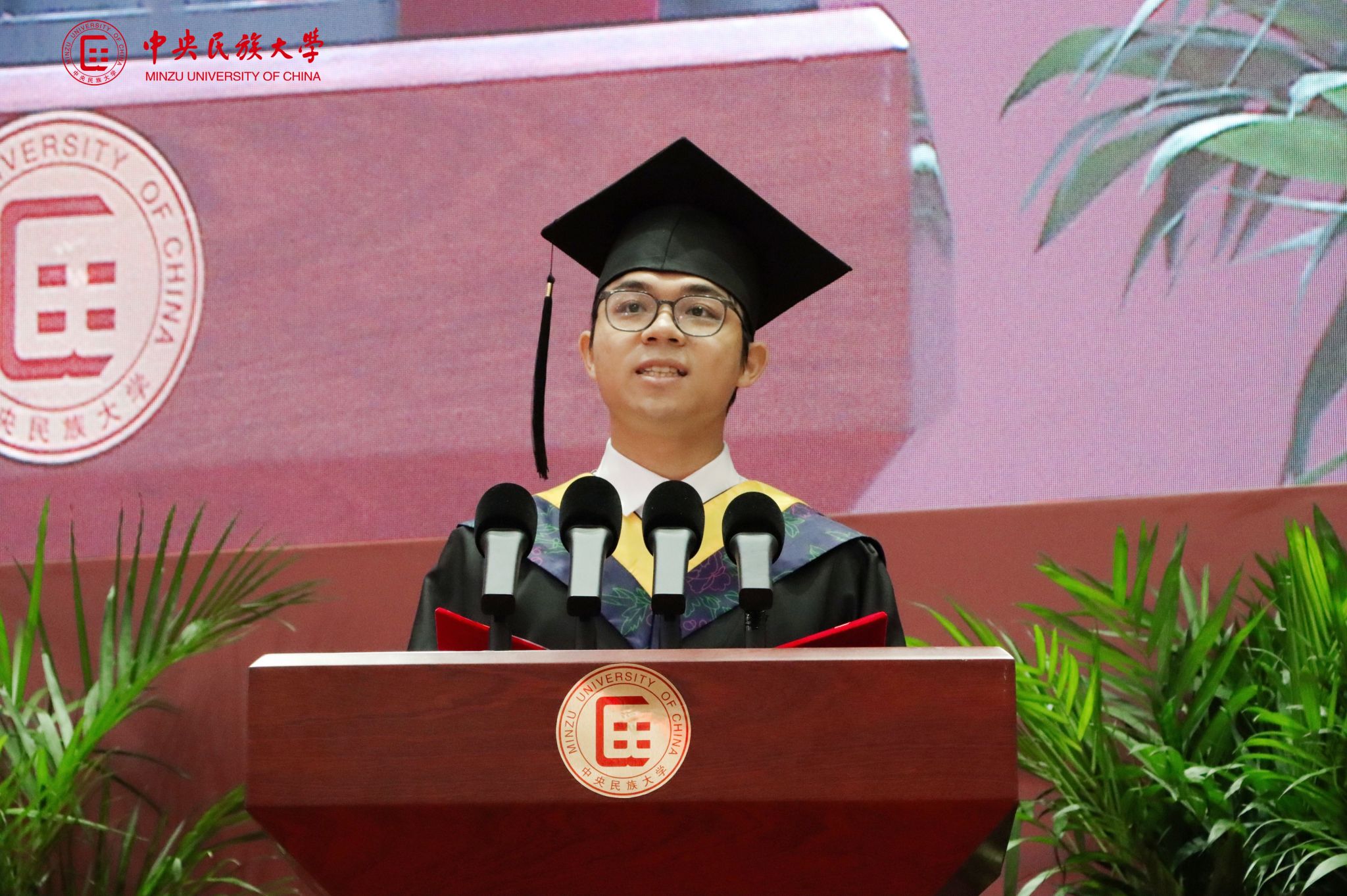 本科毕业生代表、信息工程学院曹康杰深情回顾了民大的四载春秋,感慨生逢其时,亲历和见证了党和国家的伟大变革,“此去,我们将以知识为笔、以理想为帆、以实干为桨,书写新时代的‘民大传奇’”。