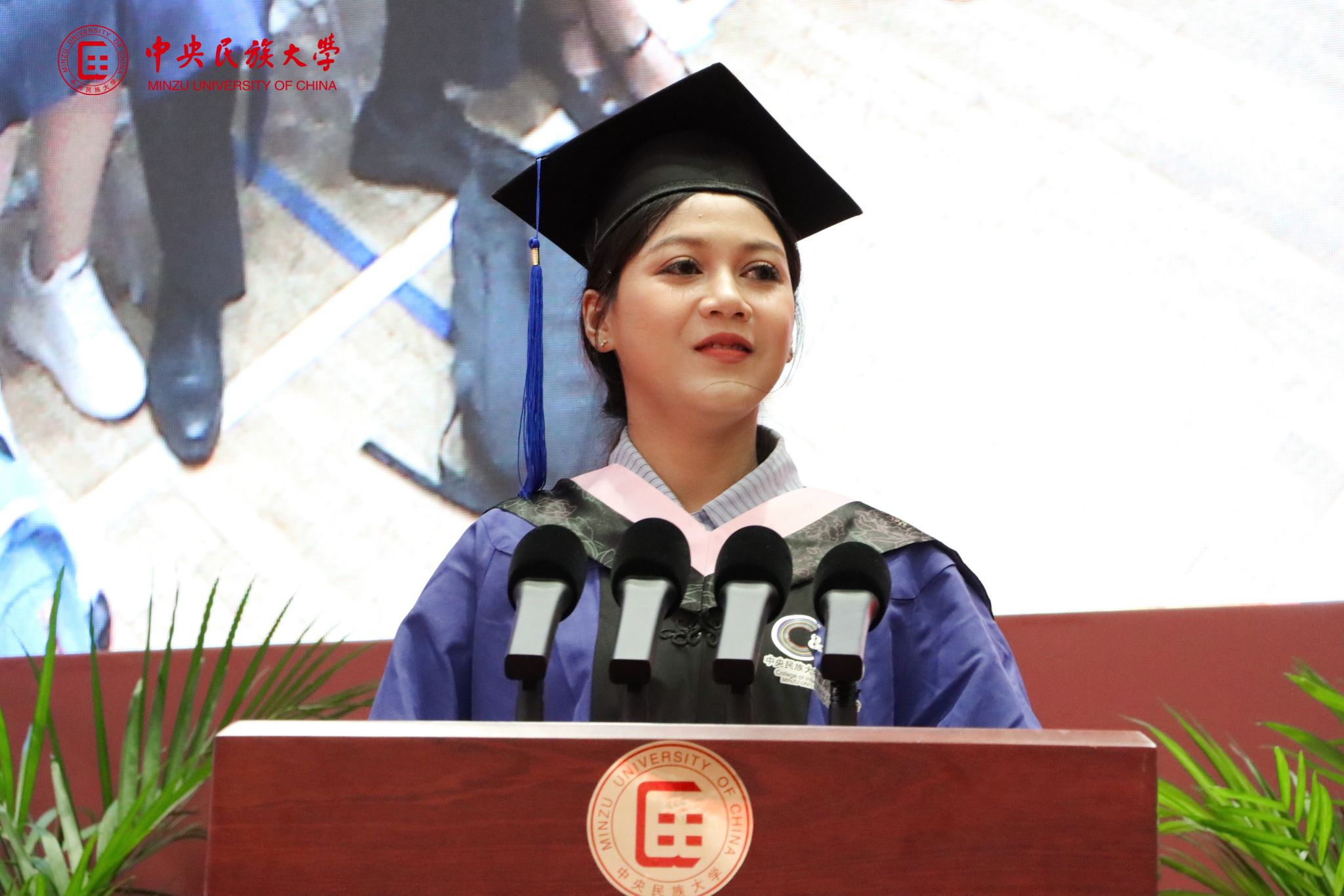留学生毕业生代表、国际教育学院泰国籍贝拉说,在民大的时光重塑了自己的人生轨迹与视野格局,深刻感受了中华文化的无限活力和“多元一体”的命运共同体。她将怀着对中华民族与中华文化的深厚情感,矢志成为连接中泰语言与文化的坚实桥梁。