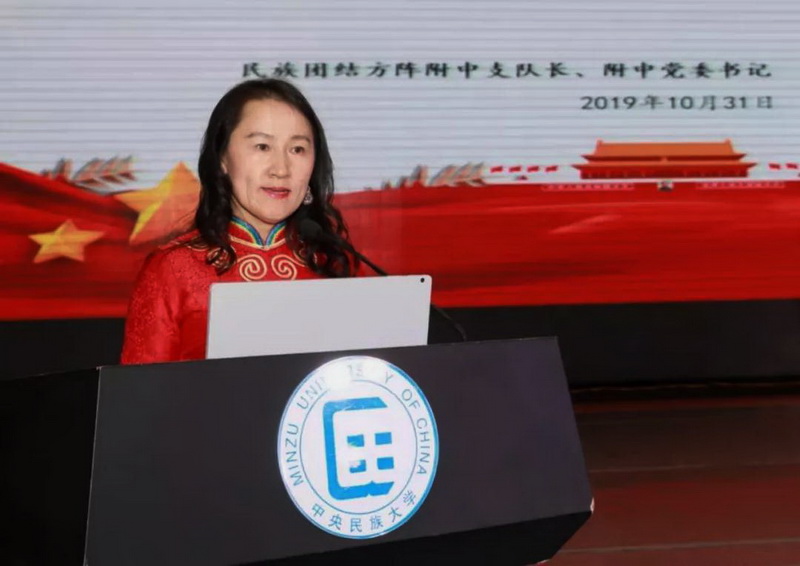 民大附中党委书记佟丽娟以“跨越数载正青春 不辱使命勇担当”为题展开宣讲。她表示,国庆盛典为各族师生创设了一门十分特殊却又意义重大的“课程”,让我们共同经历了一次前所未有、空前震撼的爱国主义教育,让我们共同谱写了一场中华民族一家亲,同心共筑中国梦的生动实践。也让师生更加明白一个道理:只有中国共产党才能实现中华民族的大团结和复兴伟业。“我们一家人都参加过国庆庆典。”她回忆了35年前,在中央民族学院附中上高二的自己,作为天安门广场组字方阵和集体舞表演成员之一,参加了新中国成立35周年庆典活动。那一年,她递交了入党申请书。今年,她作为附中党委书记,带领500名少数民族青少年,用青春的风貌为祖国的生日献上祝福,“我特别骄傲!”