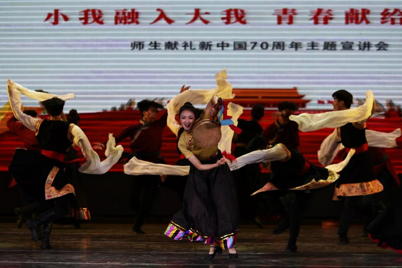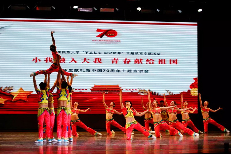 七位宣讲人分别代表“初心”“使命”“信念”“执着”“团结”“坚持”和“拼搏”七个关键词,展示了我们民大人将“小我”融入“大我”,把青春献给祖国的时代风采和精神风貌。“为了祖国的繁荣昌盛,尽情歌唱吧!为了伟大梦想的召唤,尽情欢呼吧!”宣讲大会在民族健身操队和舞蹈学院学生分别表演的获得第十一届全国少数民族传统体育运动会民族健身操比赛一等奖展示项目、庆祝新中国成立70周年天安门广场联欢节目展演中落下帷幕。