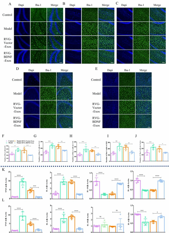 进一步研究发现,RVG-BDNF-Exos不仅能够减少抑郁样行为小鼠脑部的小胶质细胞数量,缓解神经炎症,还显著降低了星形胶质细胞的数量,这些结果进一步表明其对抑郁症有显著的治疗潜力(图4-5)。