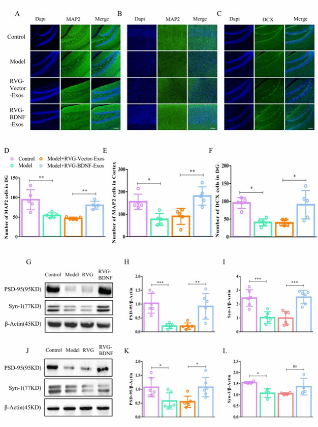 此外,RVG-BDNF-Exos治疗显著增加了小鼠海马和前额叶皮层区域的成熟神经元数量,并提高了神经发生的标志物DCX的表达。在突触可塑性方面,研究发现RVG-BDNF-Exos能够显著提高海马和前额叶皮层区域的突触相关蛋白PSD95和Syn-1的表达水平。这些结果表明RVG-BDNF-Exos可能通过促进神经发生和调节突触可塑性来增强抑郁症的治疗效果(图6)。