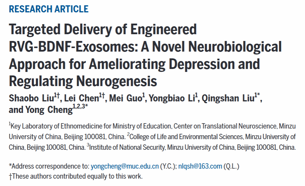 Citation: Liu S, Chen L, Guo M, Li Y,Liu Q, Cheng Y. Targeted Delivery ofEngineered RVG-BDNF-Exosomes:A Novel Neurobiological Approachfor Ameliorating Depression andRegulating Neurogenesis. Research 2024;7:Article 0402. https://doi.org/10.34133/research.0402