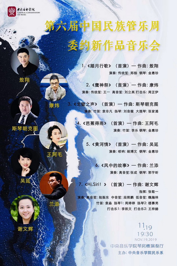 新闻网讯 2019年11月19日晚,我校音乐学院作曲系斯琴朝克图教授委约新作品《戈壁之声》,在中央音乐学院民乐系主办,中央音乐学院民乐系管乐教研室承办的“中国民族音乐节暨第六届中国管乐周”上精彩首演,获得现场嘉宾、观众一致好评。