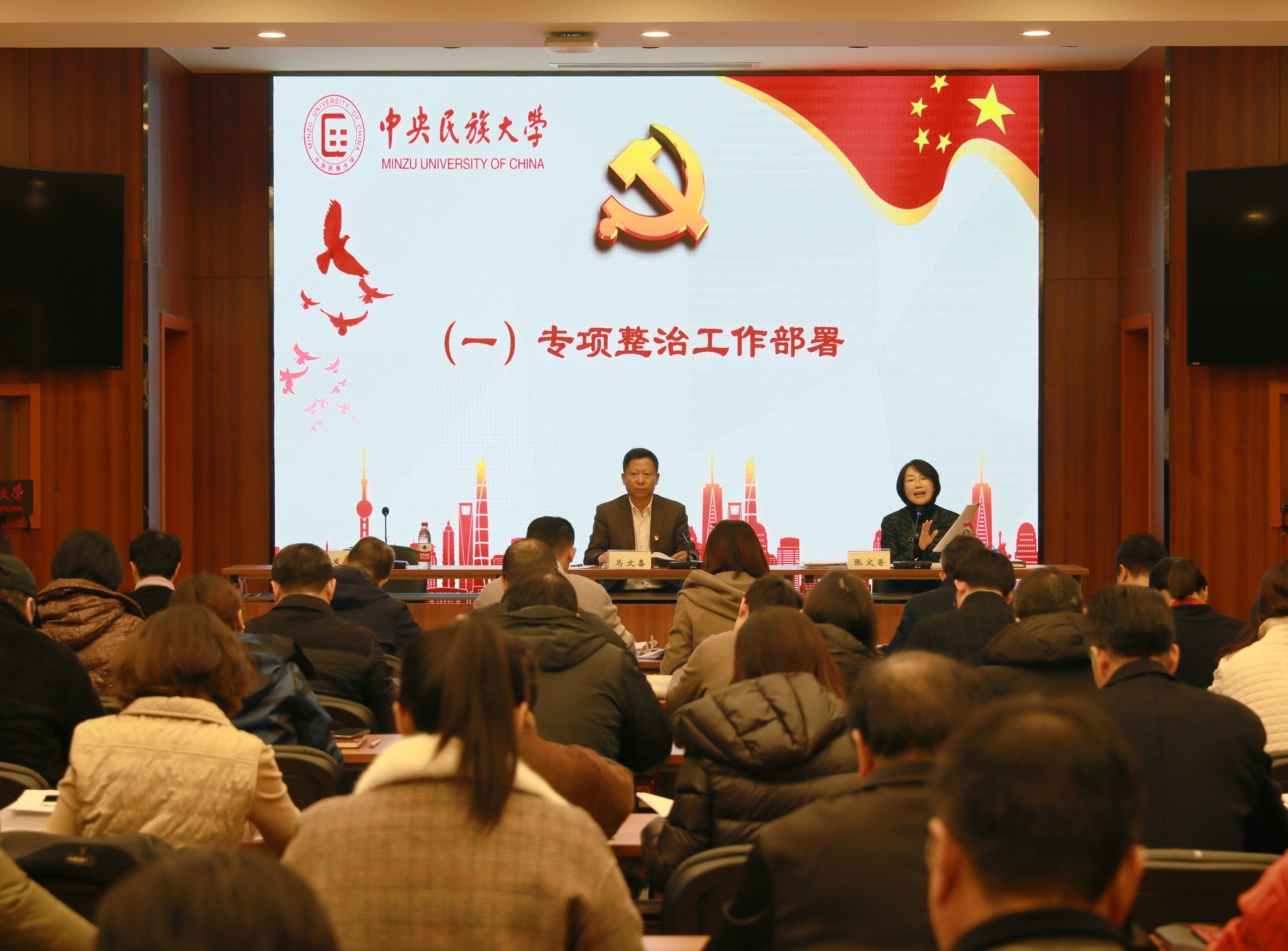 马文喜在讲话中肯定了主题教育开展以来,各单位各部门在聚焦整改、压实责任、狠抓落实方面取得了阶段性成果。他指出,专项整治是确保主题教育取得实效的重要措施,成效要经过广大师生员工的评判和检视。他强调,党的十九届四中全会提出要“建立不忘初心、牢记使命的制度”,要按照党中央的部署要求,扎实开展好主题教育的专项整治,推动形成践行初心使命的长效机制。要聚焦整治重点,着力提升整治的质量和效果。各单位各部门切实把思想和行动统一到国家民委和北京市委对专项整治的决策部署和学校党委的具体安排上来,坚持标准不降、力度不减、工作不松,一鼓作气,从具体问题抓起,从群众最不满意的地方改起,逐条逐项推进落实,扎实做好专项整治整改的“后半篇文章”。
