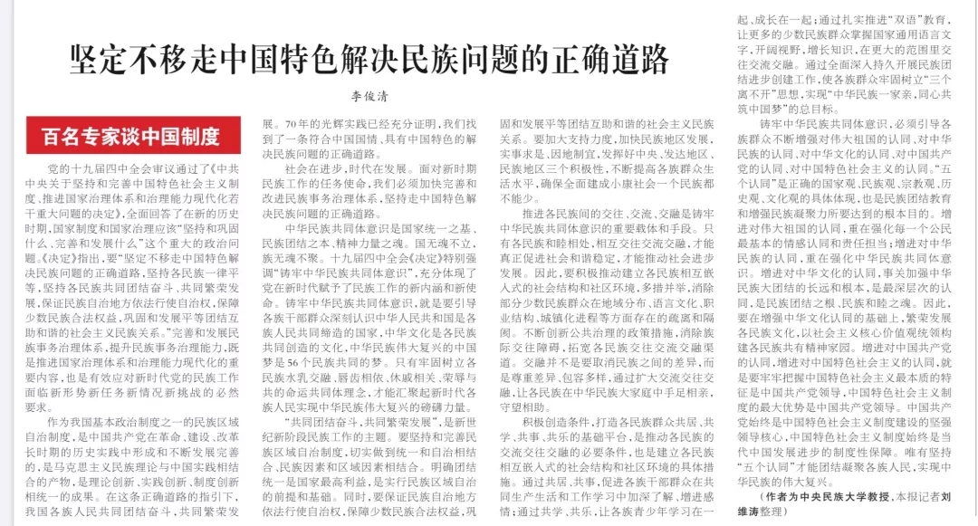 新闻网讯 近日,《人民日报》刊登我校李俊清教授《坚定不移走中国特色解决民族问题的正确道路》一文。全文如下: