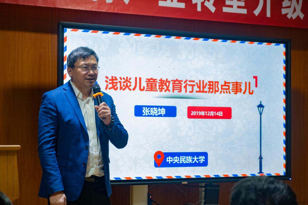 我校88级老校友、北京学前教育协会党支部书记、副会长张晓坤围绕“教育产业发展相关政策及现状”做了发言。张晓坤副会长先从家庭、人口老龄化、基尼系数等多个角度分析了儿童教育行业的发展大环境,其次又主要描述了当下学前教育的状态,聚焦普及、普惠、安全、优质的教育目标,提出向上幼小衔接、向下托育、向左家庭教育、向右培训教育的“纵横捭阖”发展方式,表达了其对中国经济和学前教育发展的乐观态度。我校教育学博士、教授、博士研究生导师史大胜作了“基于面向世界提高教育科学化的幼教产业发展思路——以美国儿童早期阅读教学与产业发展研究为例”的演讲。史大胜教授提出,教育产业转型升级的路径应该是更专业化、科学化。史教授通过对美国早期阅读中拼音教学、全语言教学等幼教教育方法和一些分级阅读测评机构的研究,对我国现今幼儿园更科学的发展提供了建议。