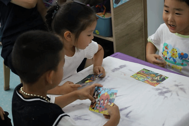 “我们一起来画石榴好不好?”乌拉特中旗第二幼儿园内,小朋友们的兴趣瞬间被调动了起来,用稚嫩的笔触一笔一画描绘出一颗颗圆滚滚的石榴。团队成员通过讲解石榴籽的寓意,巧妙引出了“四个与共”的共同体理念。而这些画上石榴的明信片更是独一无二、巧具匠心,其背景图案由民大研支团服务地云南省思茅第一小学的学生们亲手绘制,跨越千山万水而来。来信与回信之间,西南与北疆的情谊被紧密相连,这不仅是一颗颗童心对民族团结最纯真的诠释,更是对“大中小幼”一体化“铸牢”教育实践体系最生动的刻画。