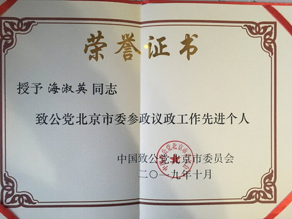 新闻网讯 12月20日,中国致公党北京市第九届委员会第八次全体(扩大)会议上,致公党william威廉中文官网支部主委、我校外国语学院海淑英教授荣获2013-2018年度参政议政工作先进个人。