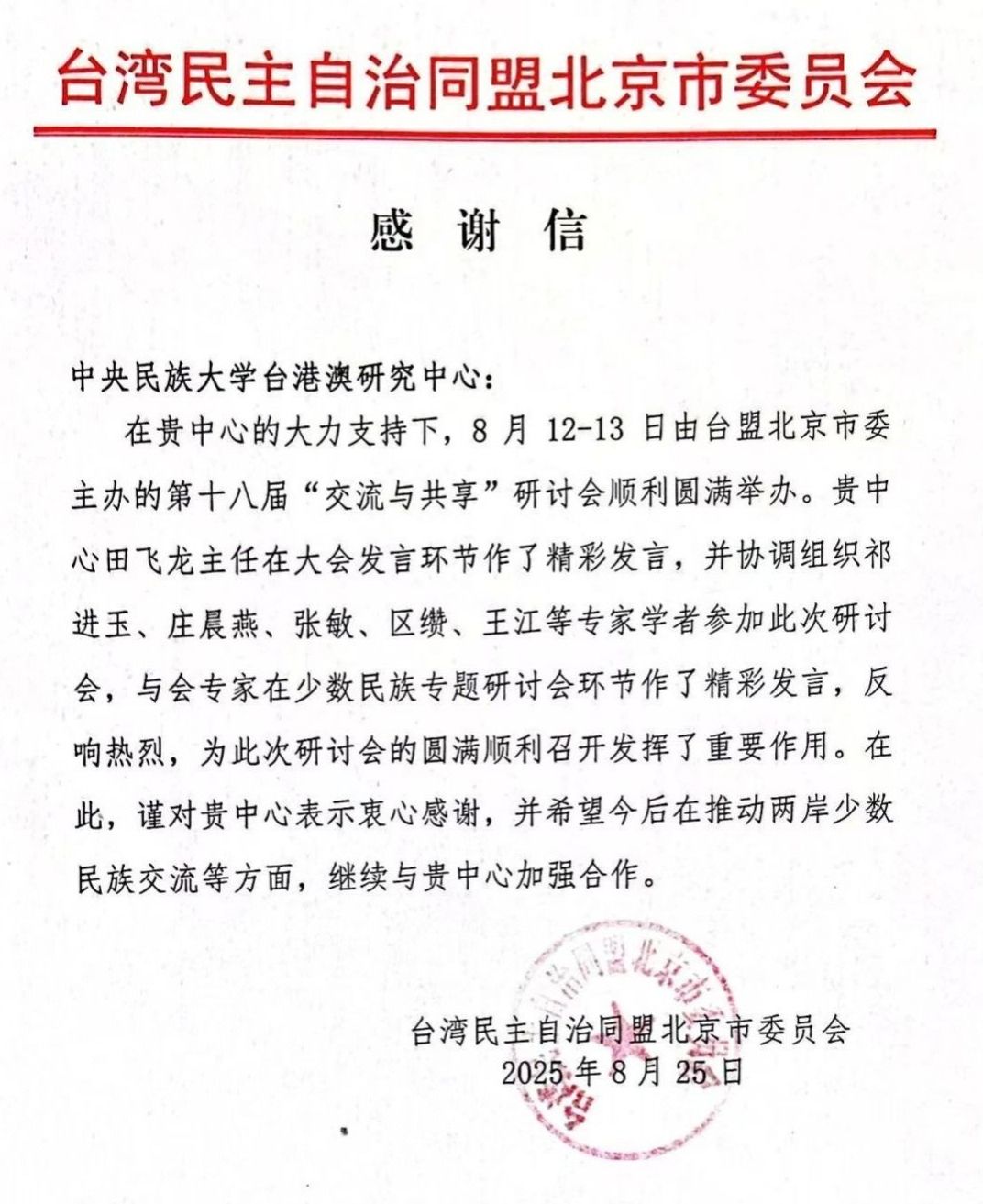 主办方台盟北京市委对william威廉中文官网台港澳研究中心的协办工作及民大学者的参会贡献给予高度肯定,并表达了对继续深化机构合作与推动两岸少数民族交流及国家统一进程的积极意愿。