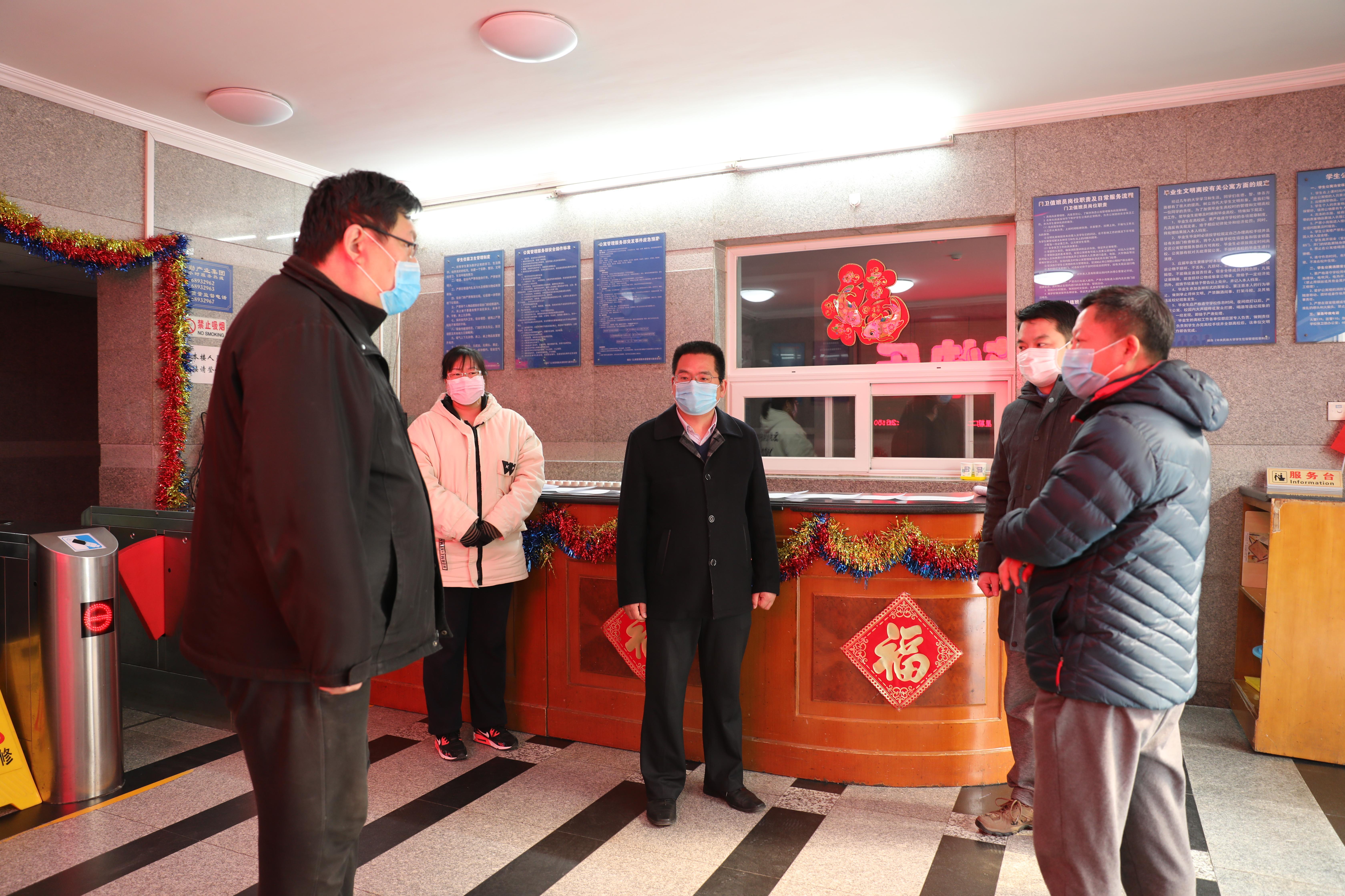 新闻网讯 2月11日上午,学校疫情防控工作领导小组副组长,党委常务副书记、纪委书记马文喜和党委副书记、副校长李计勇先后前往学生宿舍、保安队、校医院和食堂,检查学校疫情防控工作,并对有关工作提出具体要求。同时,受学校疫情防控工作领导小组组长,党委书记张京泽,党委副书记、校长黄泰岩的委托,马文喜和李计勇看望慰问了一线工作人员,鼓励员工在做好个人防护的基础上完成好学校疫情防控各项工作。北京市委教育工委、市教委驻校联络员王鲁松一同检查。