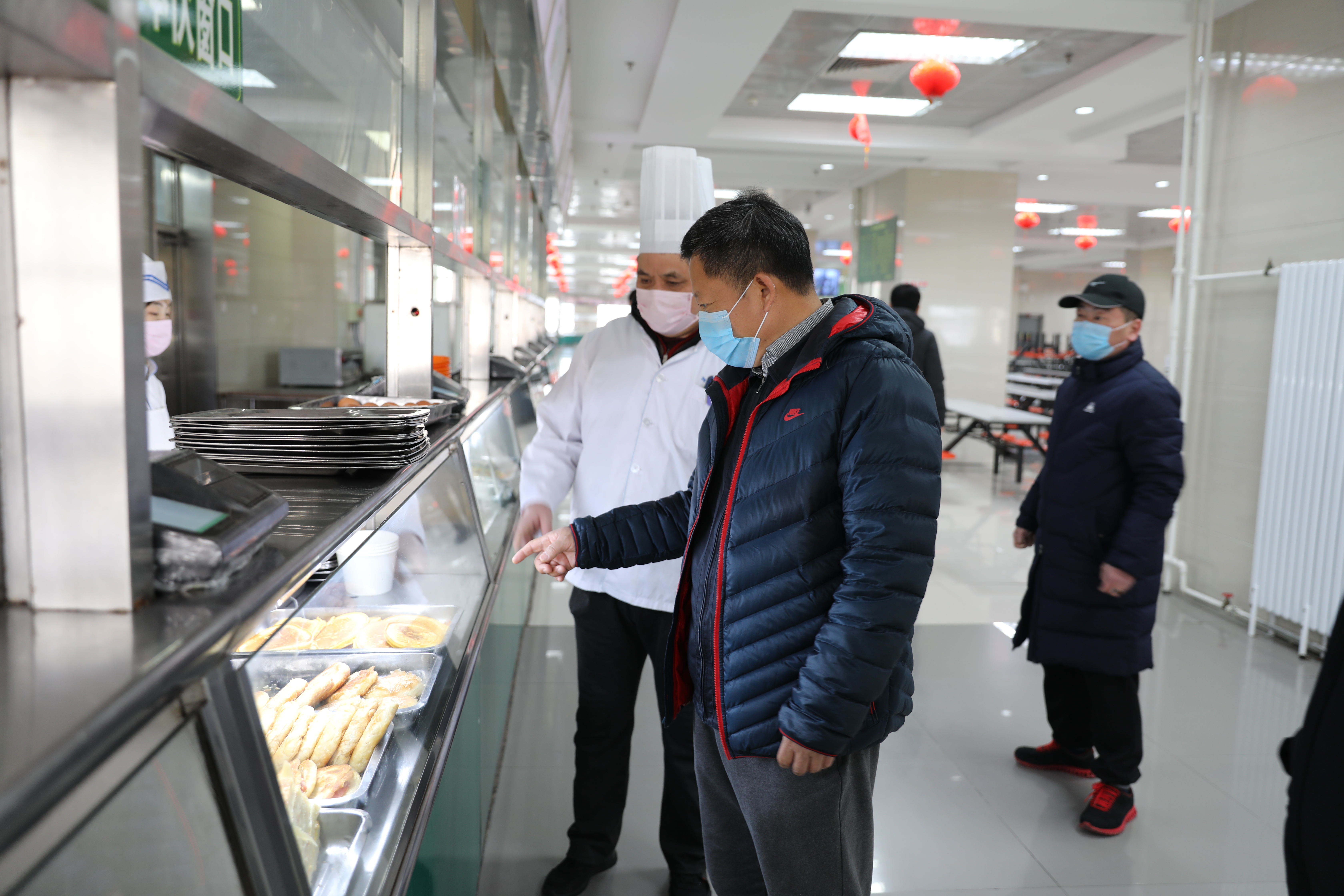 在学生食堂,马文喜和李计勇检查和了解了饭菜供应情况,要求继续强化卫生防疫,做好在校师生的后勤保障服务工作。(摄影:袁海琴、刘佳)