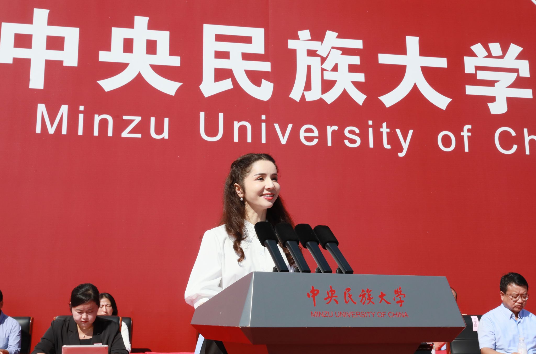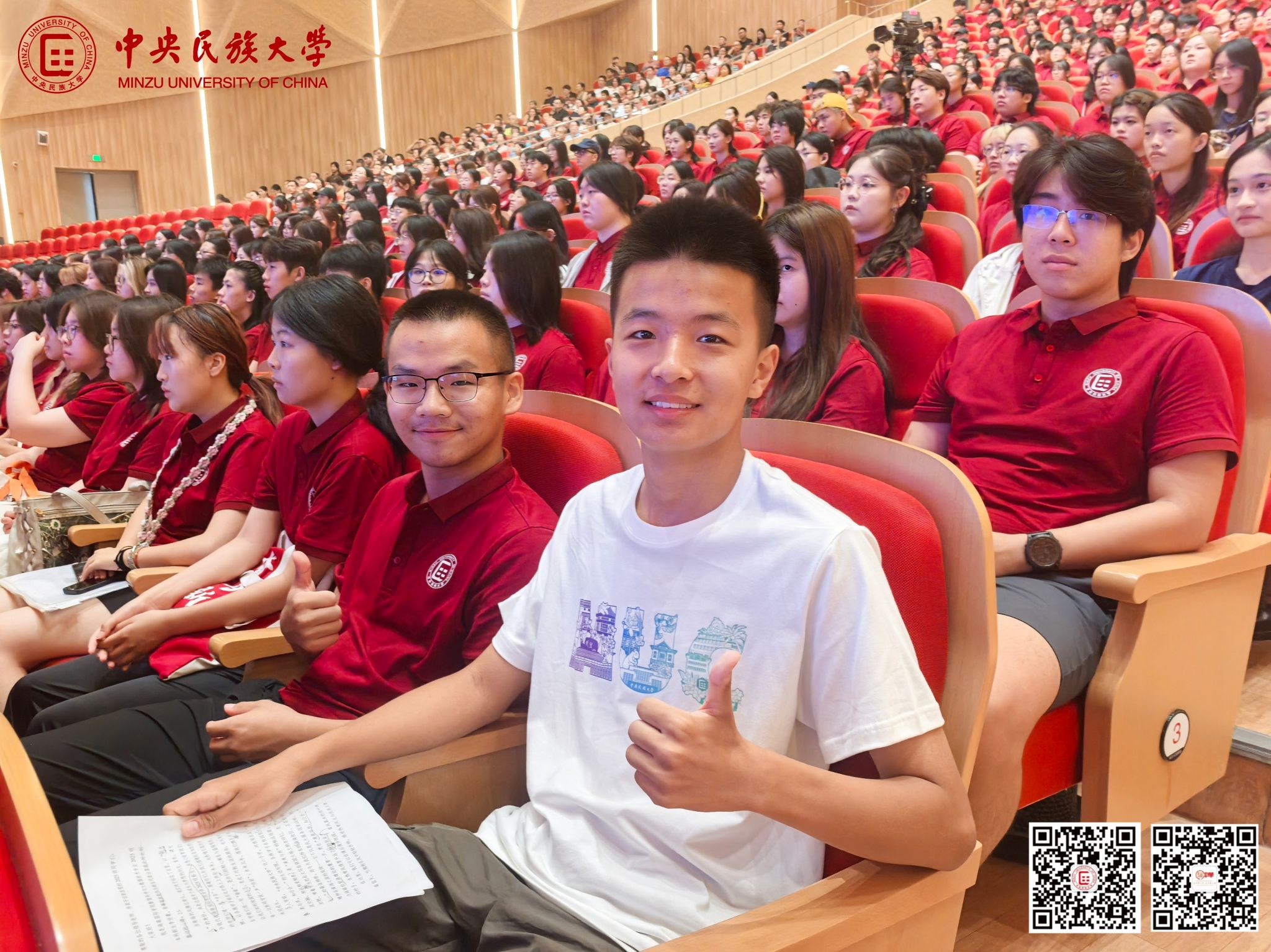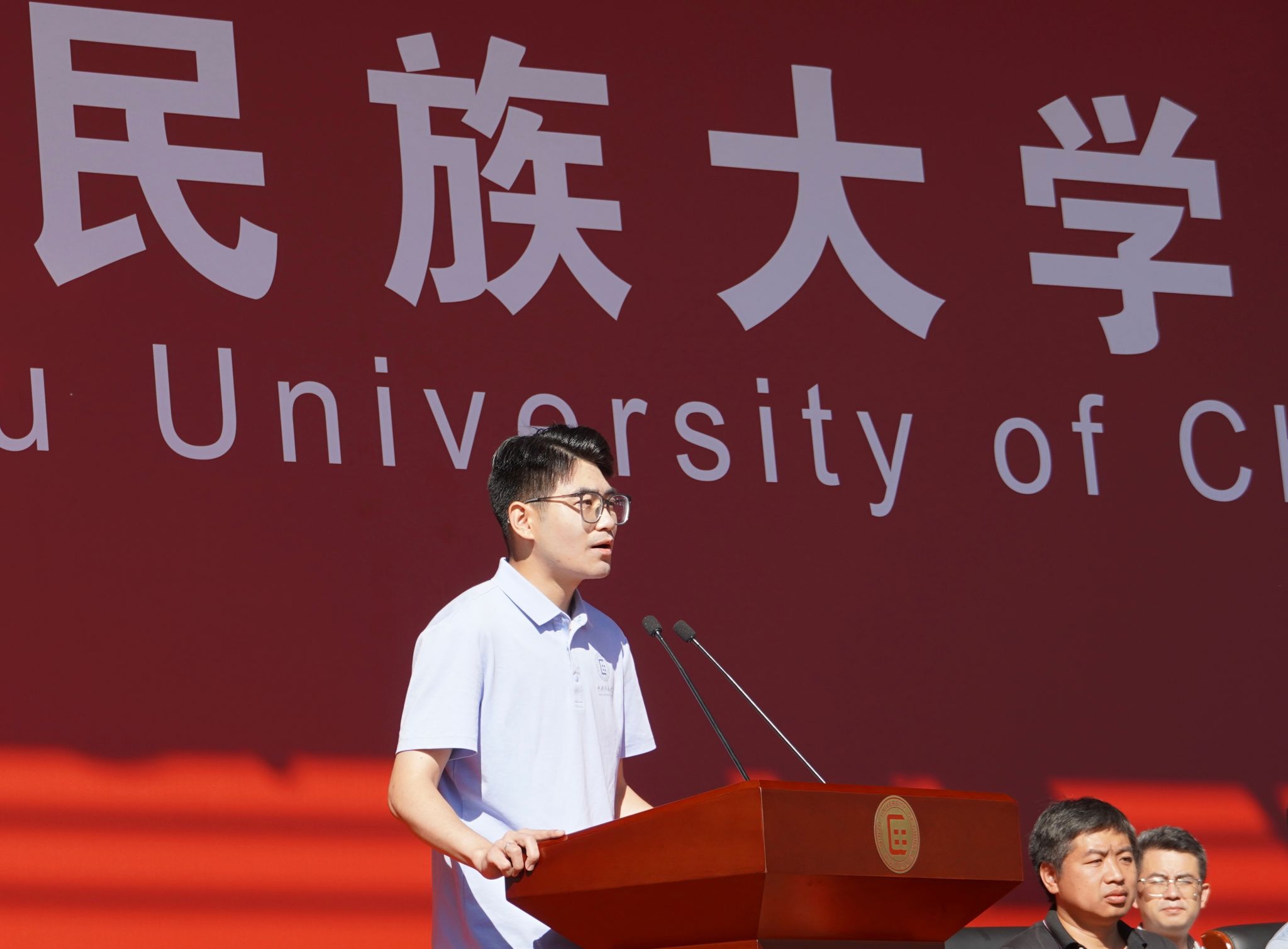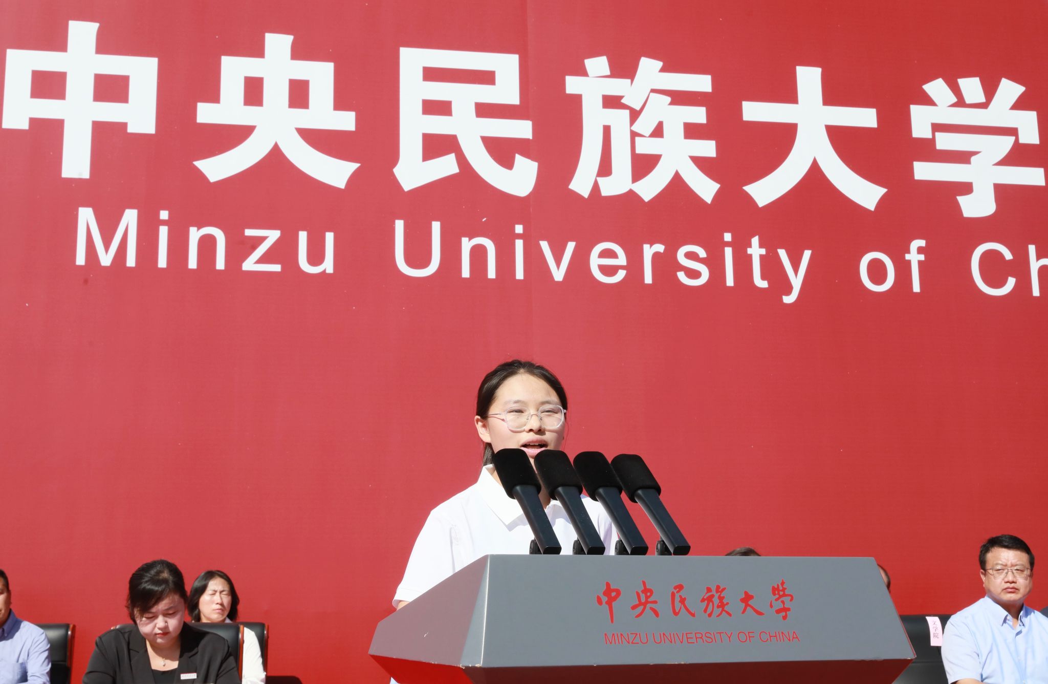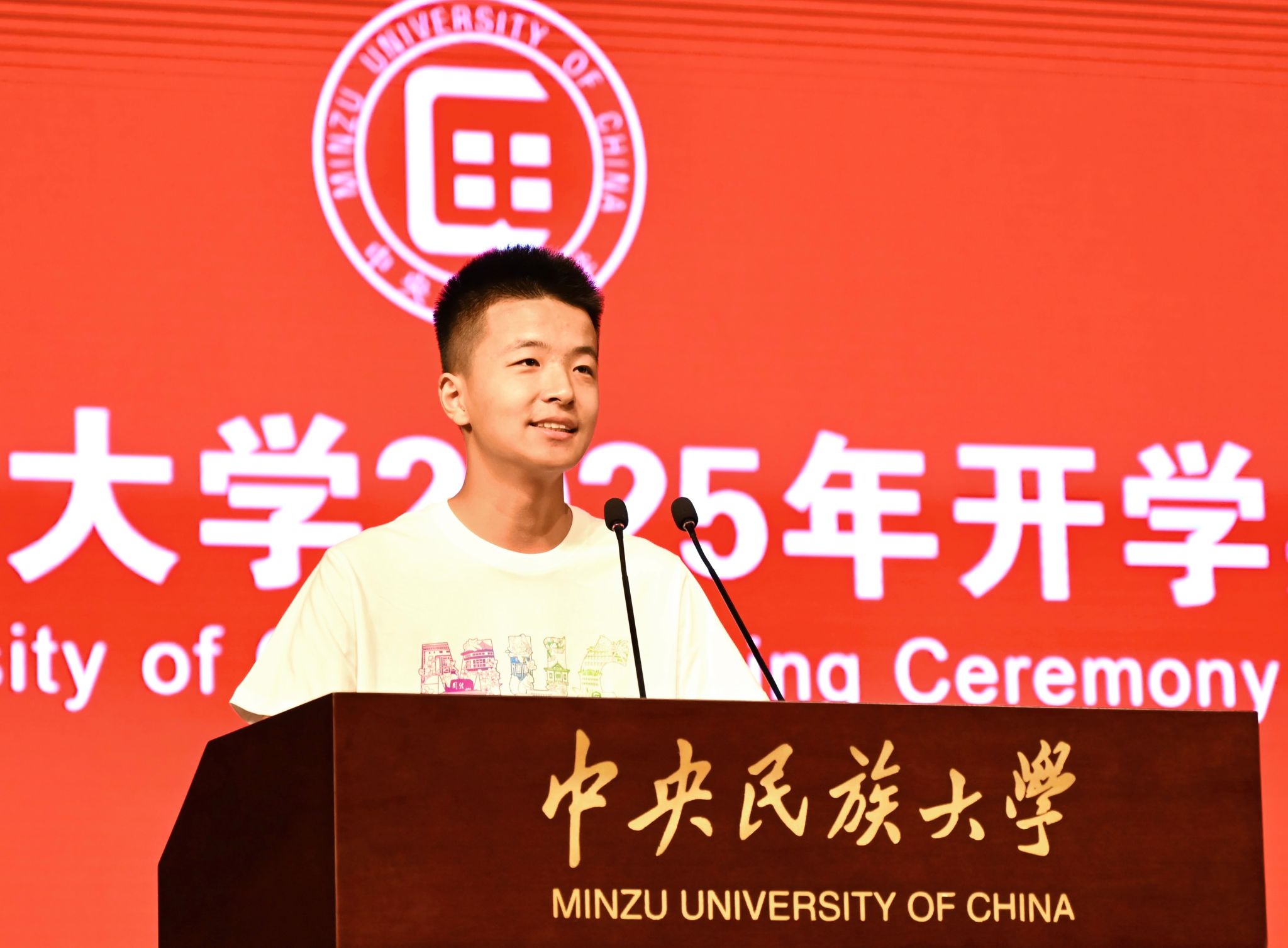 本科生新生代表、新闻与传播学院阿旺曲珍以收到录取通知书时家乡的欢庆为引,感恩党和国家为边疆民族地区学子铺就求学坦途。她向全体新同学发出邀约,勇担使命、求真创新、包容共美,用专业所学讲好中华民族共同体故事,以“强国有我”的青春誓言回应时代厚望。