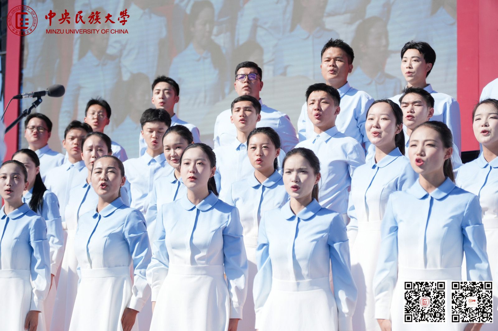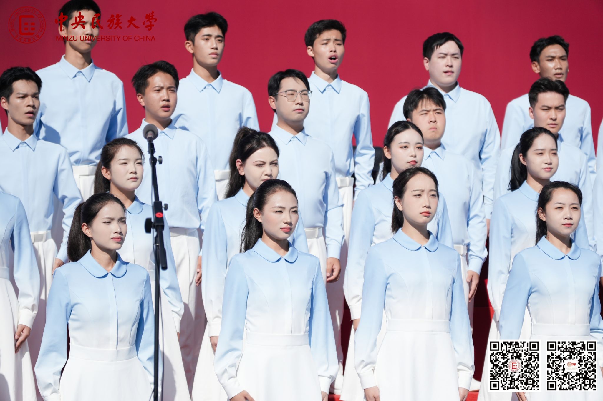仪式前,参加纪念中国人民抗日战争暨世界反法西斯战争胜利80周年大会广场合唱团的师生代表,为现场新生演唱了《松花江上》《太行山上》《保卫黄河》《没有共产党就没有新中国》等经典歌曲。