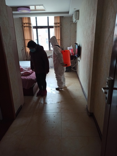 命令紧,任务重,在1天之内,要完成两个民用酒店的改造、消毒,当天晚上便要开始接收隔离人员。考虑到杨康的专业背景,镇领导让他参与到隔离点筹备建设中。为了更快地开展工作,杨康放弃了和家人共度元宵节,奔走于两个隔离点,用自己擅长的环境和消毒灭菌操作的知识和经验,从专业角度为两个酒店隔离点提出建议:首先是划分污染区、半污染区、洁净区、工作人员更衣间,将除客房以外的房间全部封闭防止污染区扩大;其次,严格要求隔离人员和工作人员不得在酒店随意走动,出污染区必须严格消毒;再次,建议隔离群众自带床上用品以缓解其紧张心情。