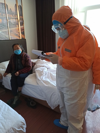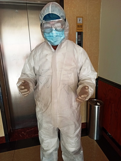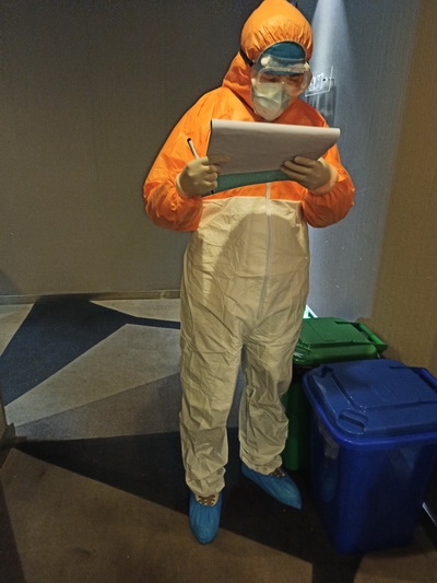 仅一天时间,锦怡酒店隔离点的被隔离者已经达到105人,分别住在酒店的2-6楼,每天上午8:30和下午1:30开始为他们测量体温,询问健康状况、是否按时吃药等,整个工作完成需要2个小时左右。每天脱下隔离服,浑身是汗,连隔离服里面的羽绒服都湿透。
