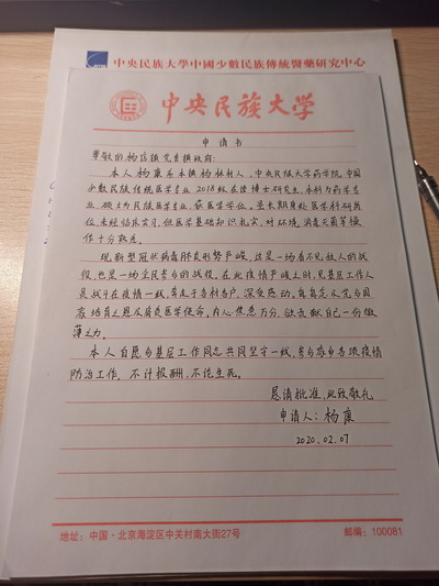 “本次疫情形势严峻,是一场看不见敌人的战役,也是一场全民参与的战役……本人自愿与基层工作同志共同坚守一线,参与家乡各项疫情防治工作,不计报酬,不论生死。”新型冠状病毒引发的肺炎疫情发生后,看到基层工作人员战斗在疫情一线,深受感动的杨康想到党与国家培育之恩和肩负的医学使命,毅然于2月7日写了一封“请战书”。生逢其时,身肩重任,国家有难,舍我其谁。从杨康的请战书中,我们看到了中国青年越是艰险越向前的刚健勇毅、更看到了中国青年迎难而上、挺身而出的使命担当。