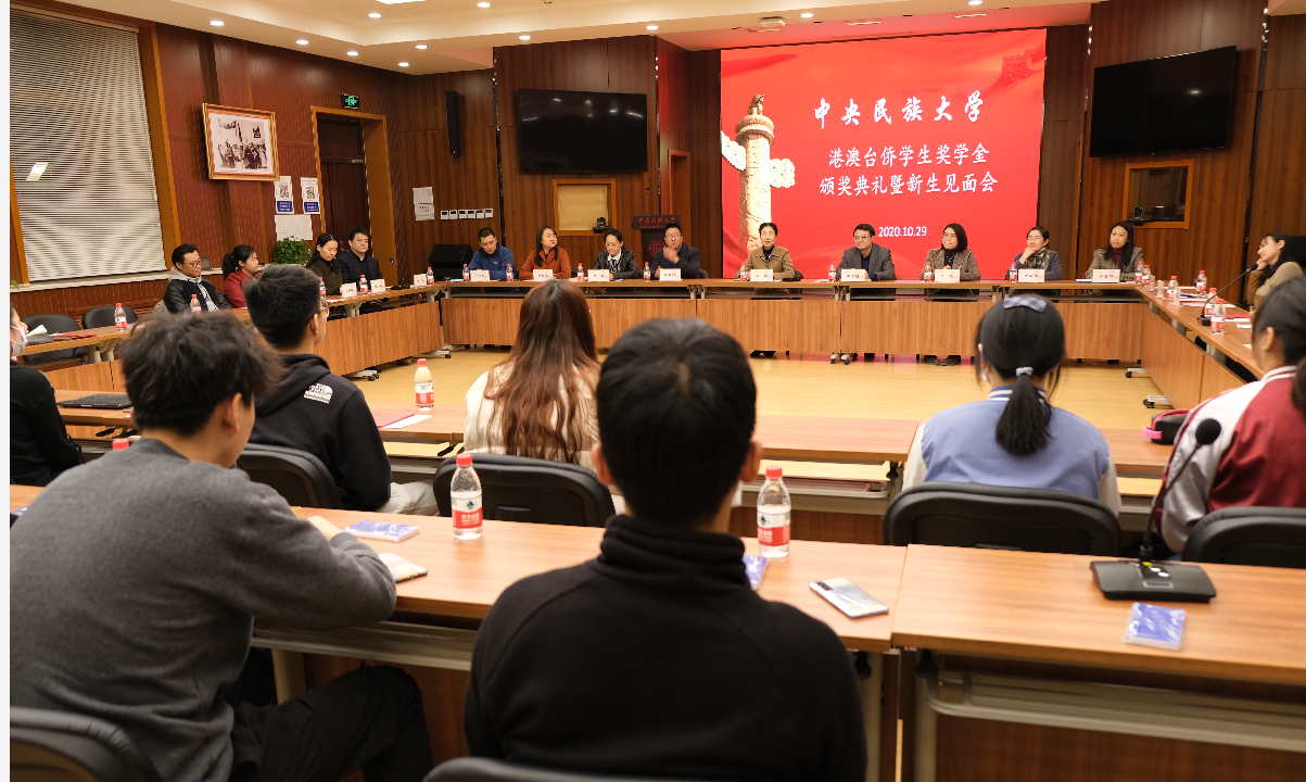 宋敏为获得奖学金的同学颁发了获奖证书,对获奖同学表示诚挚祝贺,并对2020级新生的到来表示热烈欢迎。宋敏说,今天特别高兴,第一是因为我校港澳台侨老生、新生能克服诸多困难和不便,平安、顺利地返校,在疫情之后再次见到大家,实属不易,体现了大家对民大的真爱,民大校园因为有了你们才更加美丽;第二是我校越来越多的港澳台侨学生获得教育部奖学金,这是因为我们学校越来越受到港澳台侨学生的关注和喜爱,学生人数逐年递增;第三是通过刚才大家的发言,可以看出同学们有了很大的变化,已经不可同日而语,大家在这个校园里得到了成长。她希望同学们将敦促的“小鞭子”拿在自己手里,时时敦促、多多积淀,拿出“罗马不是一天建成的”精神,让优秀成为一种习惯,尽快融入这精致美丽的校园,用大家自身的学习、生活经历感染更多的人,让“美美与共、知行合一”的校训得到升华。