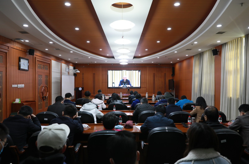 报告会以视频会议形式召开。我校在校校领导,职能部门、教学科研单位主要负责人在中慧楼第一会议室通过视频集体学习。(摄影:马丹妮)