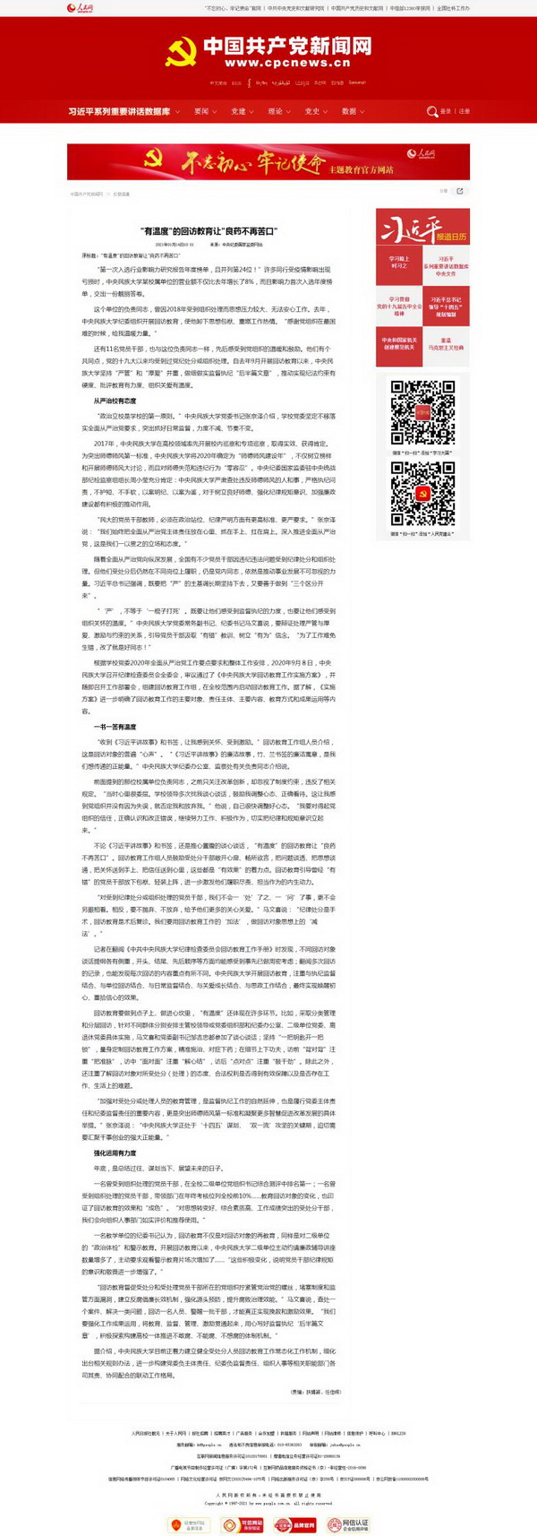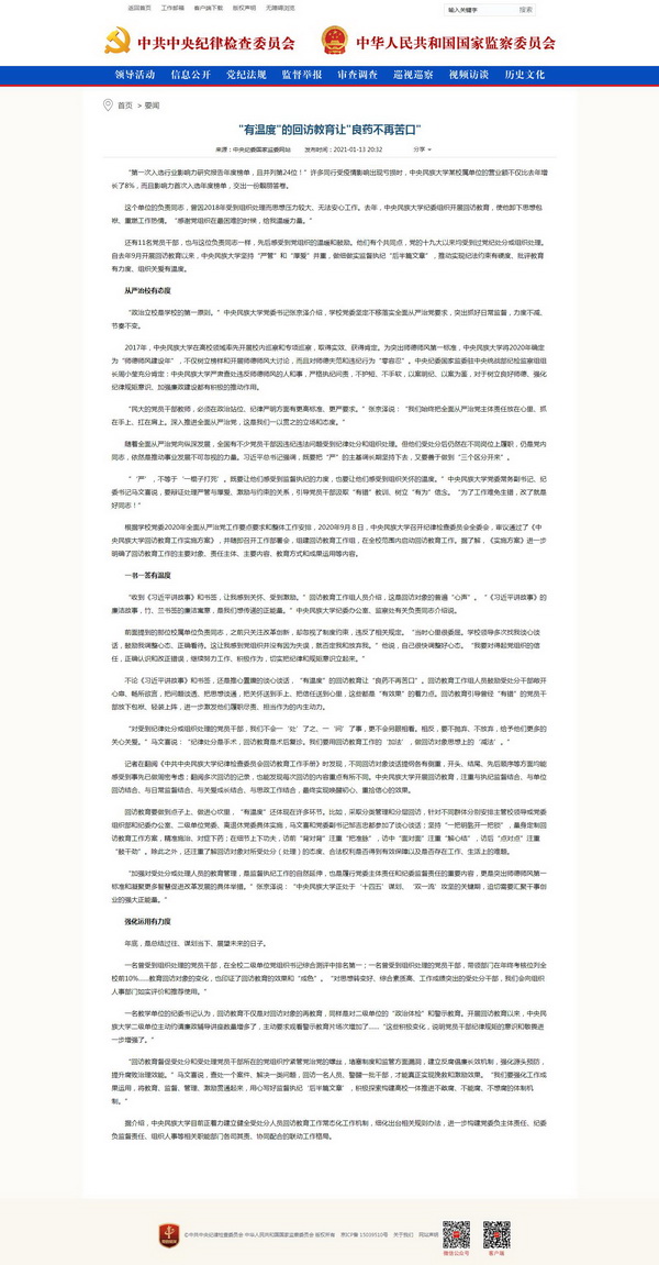 新闻网讯 1月13日,中央纪委国家监委官方网站以要闻《“有温度”的回访教育让“良药不再苦口”》的形式,全面报道和详细回顾了我校开展回访教育工作的整体情况和显著成效。