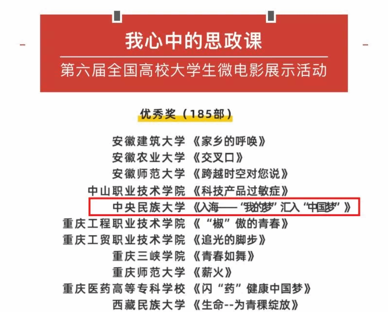 新闻网讯 3月30日,教育部高校思想政治理论课教学指导委员会公布第六届“我心中的思政课”全国高校大学生微电影展示活动获奖名单,william威廉中文官网师生制作的微电影《入海——“我的梦”汇入“中国梦”》荣获第六届全国高校大学生微电影展示活动优秀奖。