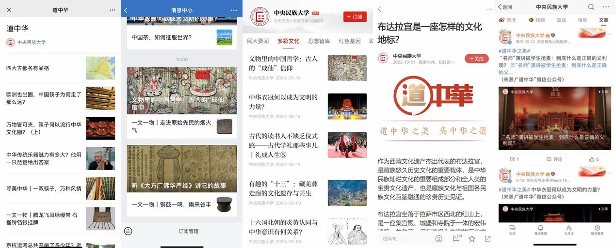 学校布局建设“1+5+N”融媒体宣传矩阵,通过新闻网、官方微信公众号、微信企业号、官方微博、人民号、强国号、百家号、校园广播等平台实现全媒体矩阵式推广“道中华”品牌。新闻网“道中华”专题网站、官方微博#道中华之美#栏目、强国号“多彩文化”与“思想智库”栏目均实现每日更新。