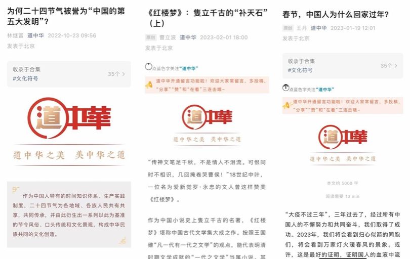 关注“道中华”微信公众号,一起破解中华文明绵延不断的历史密码,一起探寻中华民族自信屹立的思想根脉,一起挖掘中国道路创新发展的文化底蕴……在“以中国式现代化全面推进中华民族伟大复兴”的时代召唤下,让我们共同致力于推动大众铸牢中华民族共同体意识、弘扬中华优秀传统文化,道中华之美,美中华之道。