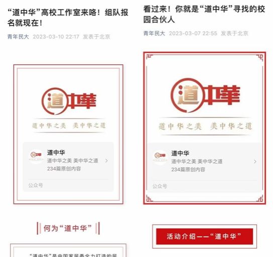 青年民大公众号发布推文《关注+1,约你一起“道中华”!》《看过来!你就是“道中华”寻找的校园合伙人》《“道中华”高校工作室来咯!组队报名就现在!》,面向全校师生开展“道中华”志愿者、工作室征集,截至3月13日,百余名学生踊跃报名参与道中华校园创作“合伙人”计划,拼创意、展才华、证青春,为记录伟大时代,推介大美中华贡献力量。