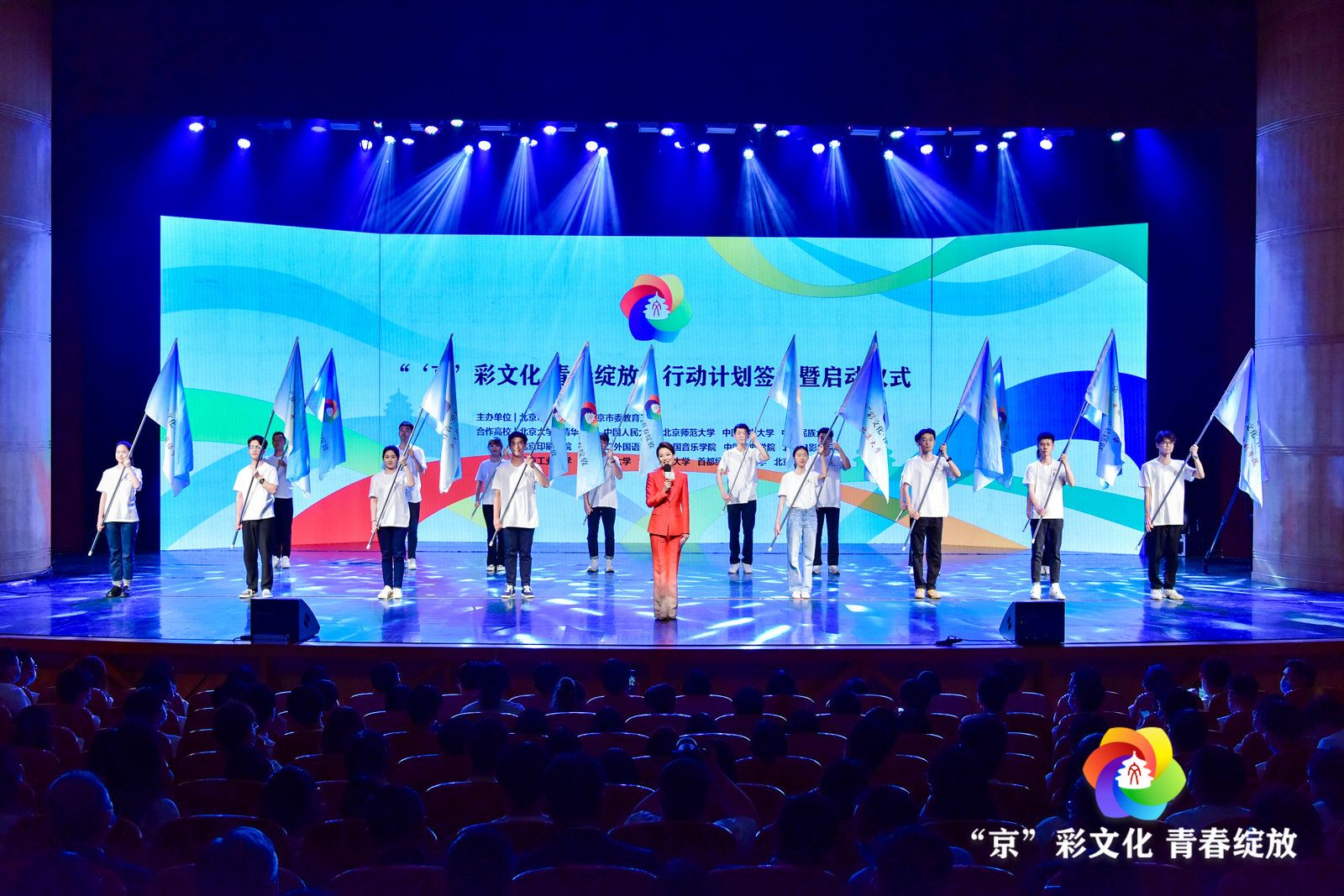 启动仪式分别从“信仰行、红色行、古都行、文艺行、志愿行、园区行”6个篇章,通过讲述身边故事,现场表演展示,引导广大青年争做首都文化的守护者和传播者,与时代同向同行、为时代立言立行。会上,北京市委宣传部、北京市委教育工委与16所试点高校签订合作共建协议,游钧、莫高义为16所高校大学生代表授旗。