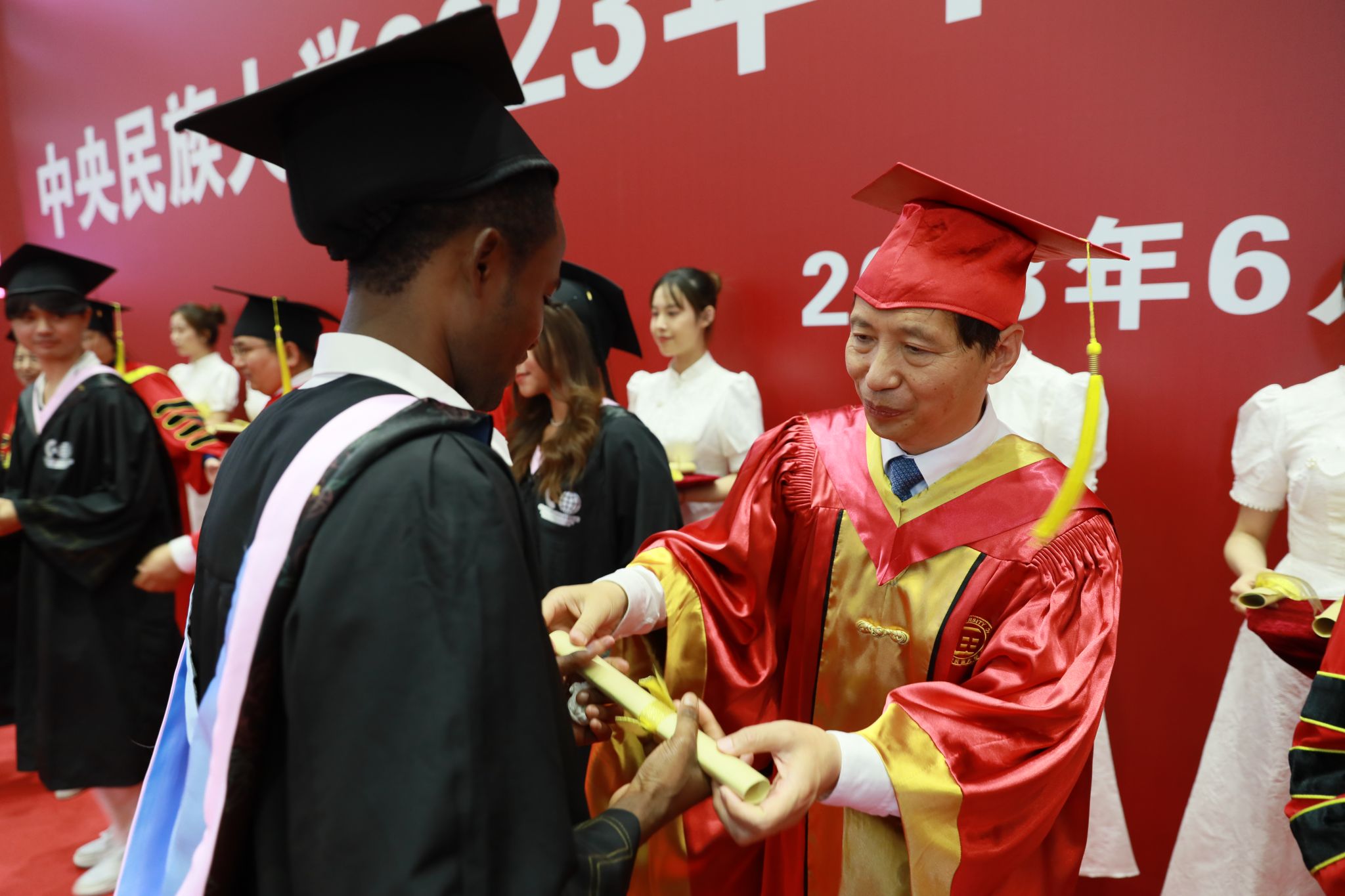 “千言万语道不尽学校对你们‘爱爱爱不完’的心情,你们留下的民大声音、民大瞬间、民大故事,我们会倍加珍藏。你们通过奋斗,披荆斩棘,取得了喜人成绩,你们还要继续奋斗,勇往直前,创造更加美好的明天!”在挥手告别、开启崭新的人生篇章之际,郭广生深情嘱托即将远行的同学们:要把爱我中华的种子植入心灵深处,无论身处何种岗位、从事哪种职业,都要心怀爱国之情、砥砺强国之志、实践报国之行,让爱国主义精神代代相传、发扬光大,为中华民族伟大复兴添砖加瓦、增光添彩;要做铸牢中华民族共同体意识的传播者、践行者和先行者,发扬“美美与共、知行合一”的校训精神,在中华大地上生根发芽、茁壮成长,成为新时代民族团结进步事业的栋梁之材;要学会在“自找苦吃”中收获“甘甜”,经得住青年时期的摔打、挫折、考验,要在“自找苦吃”的过程中迎难而上、求实求新,必将收获成功,收获喜悦,收获甘甜;要学会扬互利共赢之帆、把团结合作之舵,坚持做敢于合作、乐于合作、善于合作的人,收获团结协作带来的团队化干事创业的爆表能量。