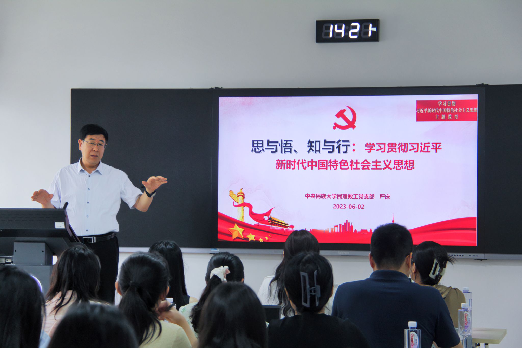 全国高校“双带头人”教师党支部书记工作室负责人、中国民族理论与民族政策研究院院长严庆教授为全院师生讲授专题党课,引导与会党员同志要始终与人民心心相印,与人民同甘共苦,与人民团结奋斗,努力向历史和人民交出一份合格的答卷。